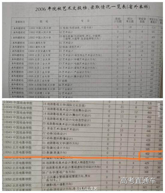 有细心网友在2007年的一本山东现代教育艺术类指导专刊中找到了北京电影学院2006年在山东的录取分数线。哪一年,北影当年在山东招生两人,文化成绩分别是402和348分,