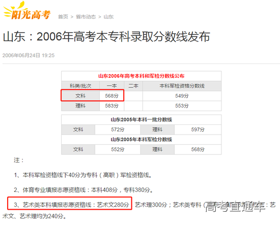 然而这种说法忽略了一个重要前提:表演是艺考专业,录取参照的应该是艺术类分数线,而非普通文理科分数线。通过查阅,我们发现2006年山东高考艺术类本科填报志愿资格线为:艺术文280分。可见无论是402还是348,翟天临都可以说自己高考成绩超过一本线。