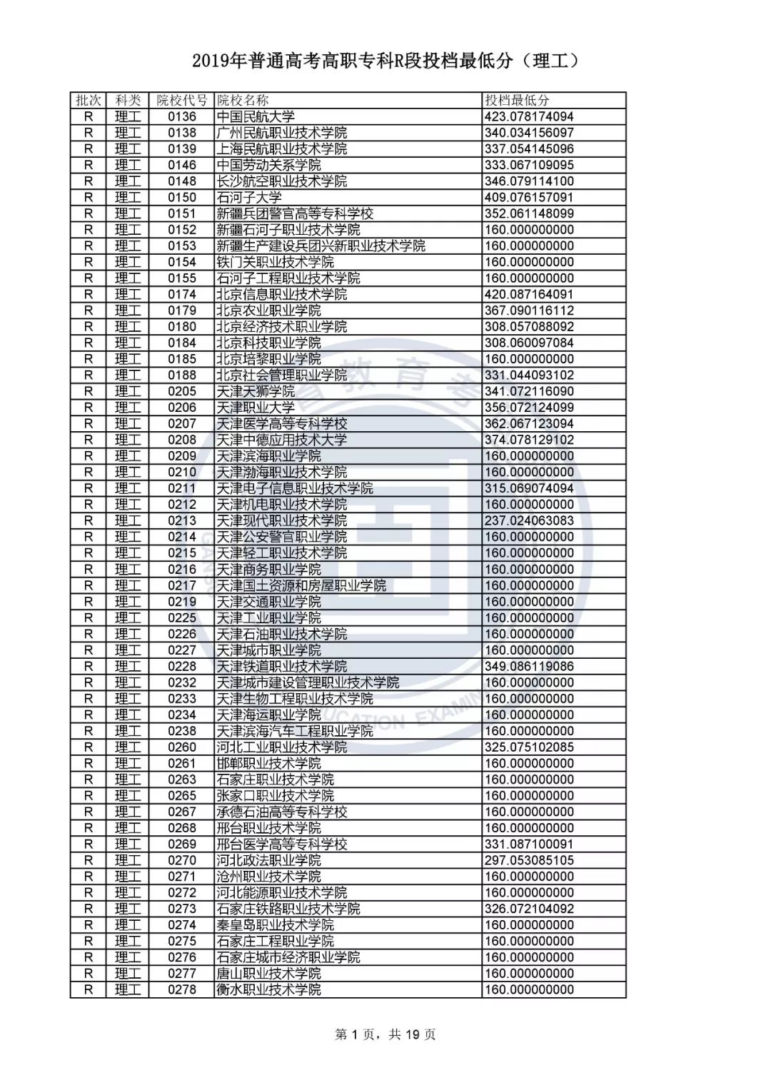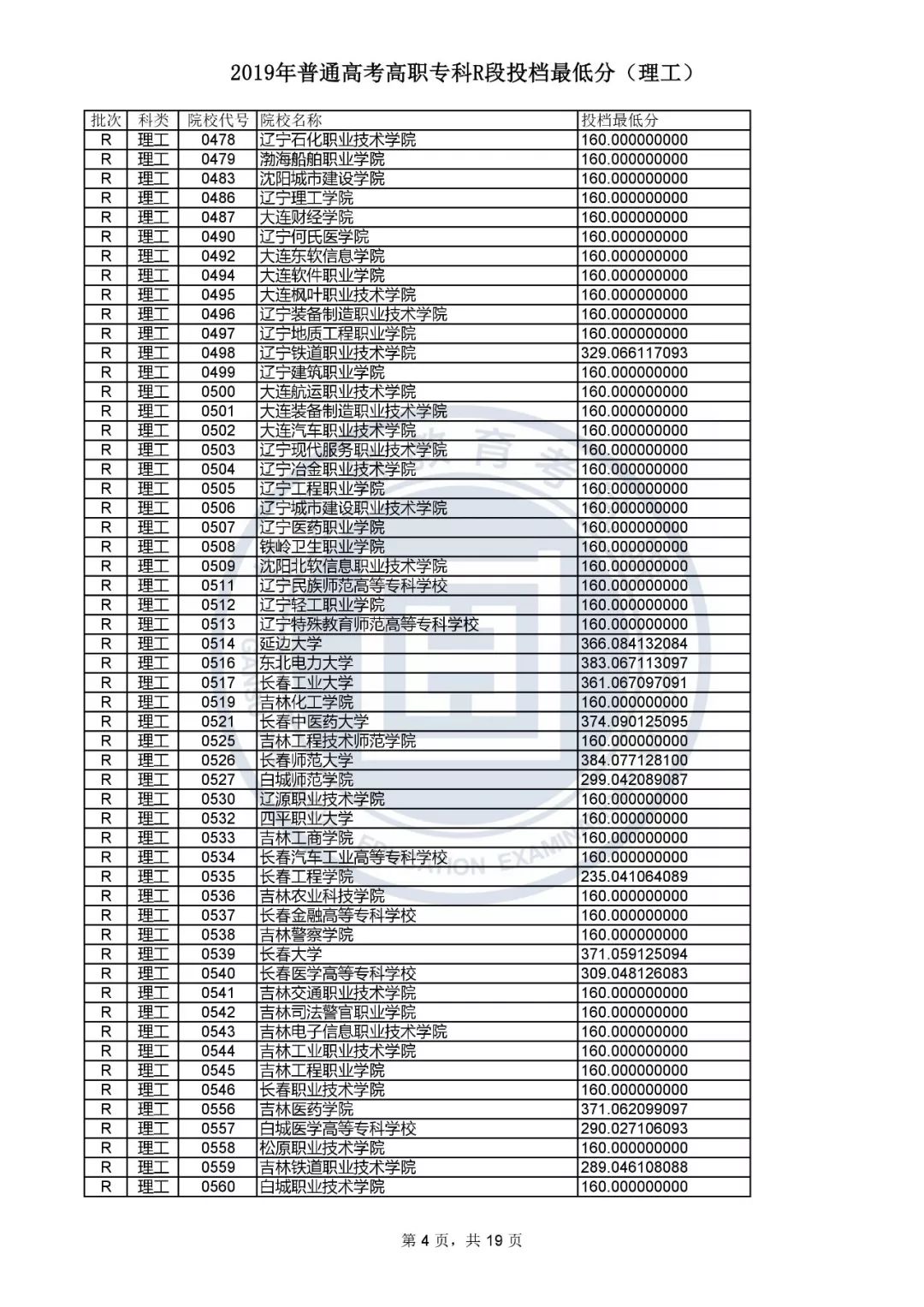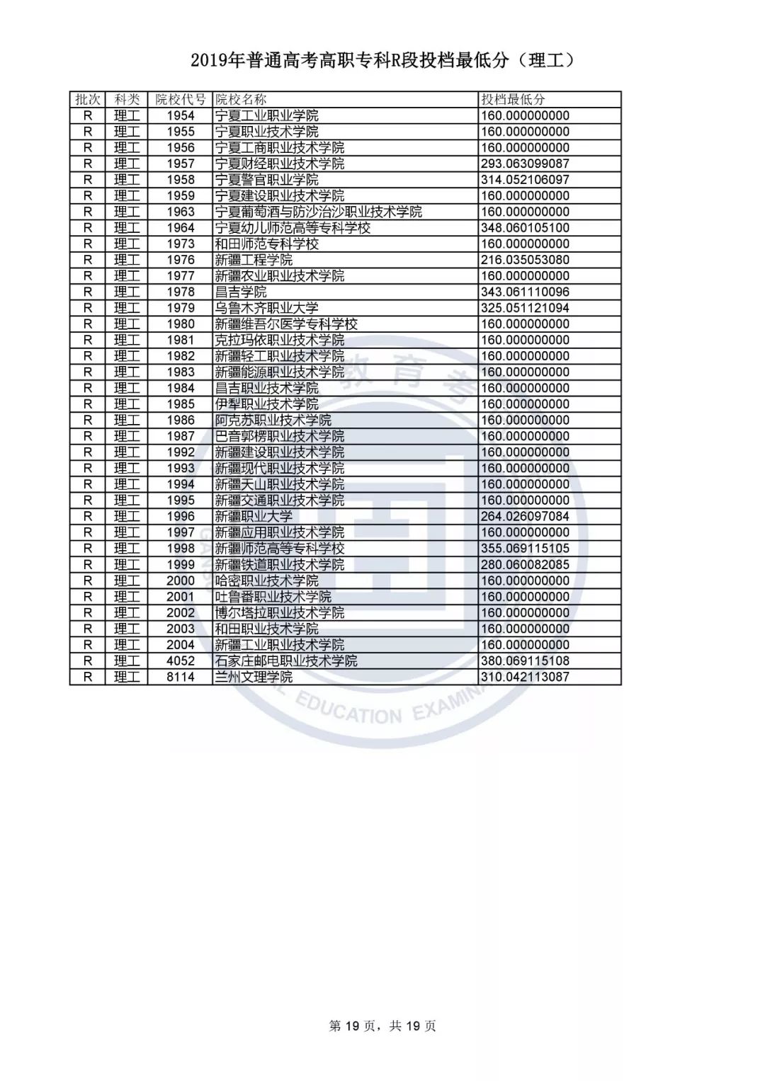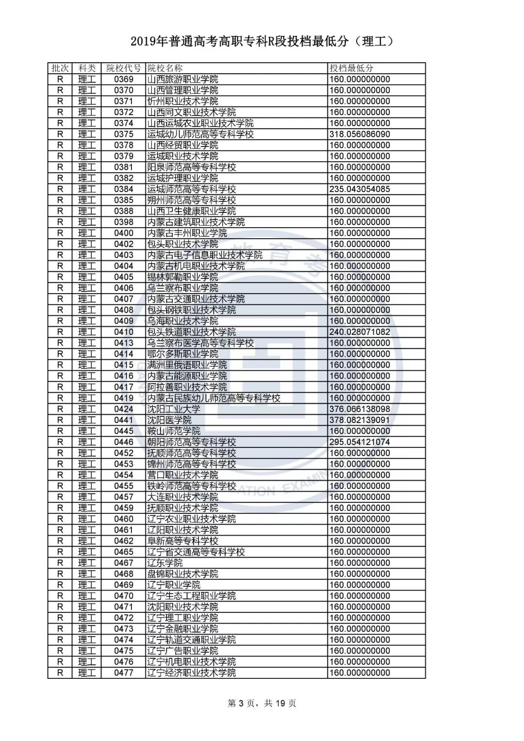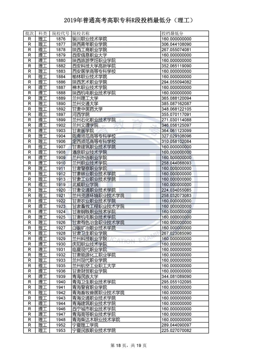 2019甘肃高职(专科)R段投档最低分(理工类)