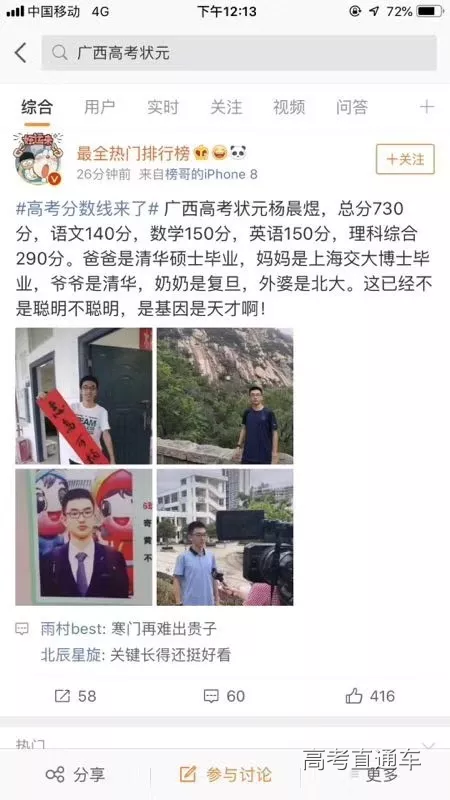 有网友评论称“杨晨煜全家人是小区里的风云明星,爸爸爷爷外公清华毕业,外婆北大奶奶复旦,妈妈上海交大毕业,属学霸之家”。