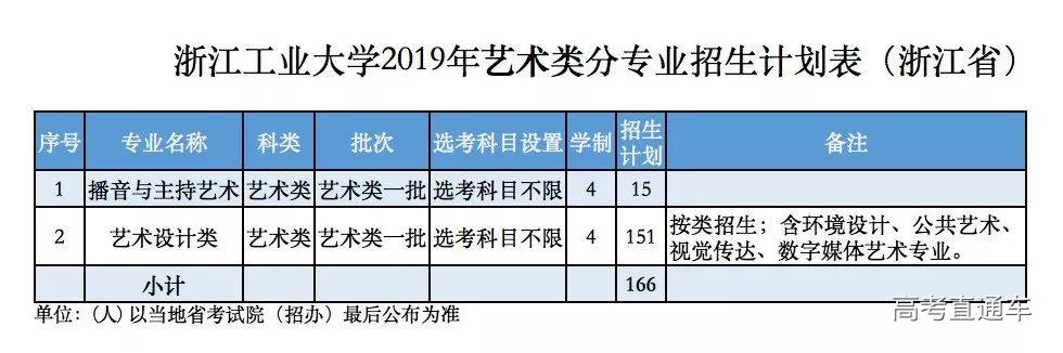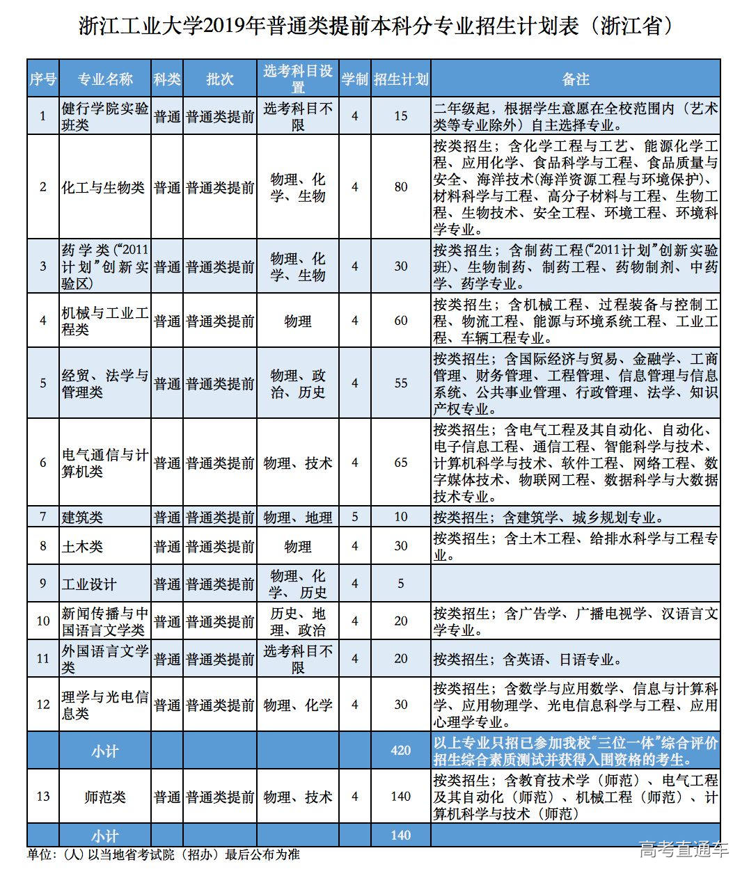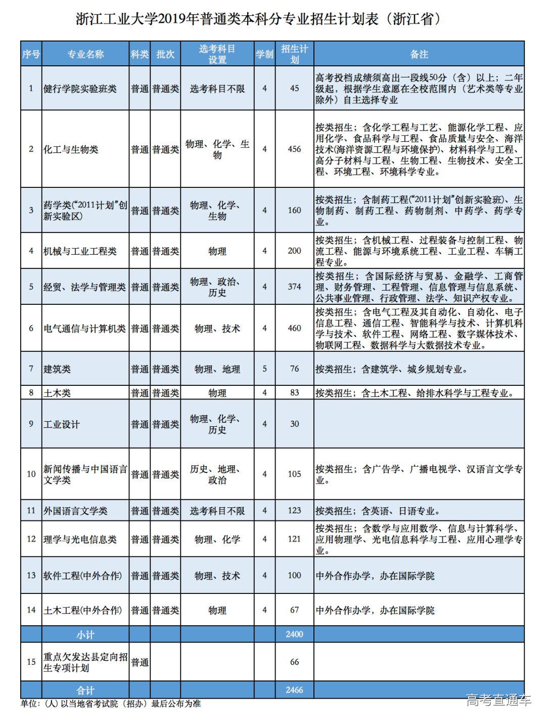 浙江工业大学在全国所有省份均有招生,2019年预计计划招生4814人。浙江省内计划招生3192人,其中“三位一体”综合评价招生420人,普通类提前(师范类)140人,普通类2233人,艺术类第一批166人,省内地方专项计划66人,中外合作办学专业(软件工程、土木工程)167人。在绝大部分外省均为一批招生。