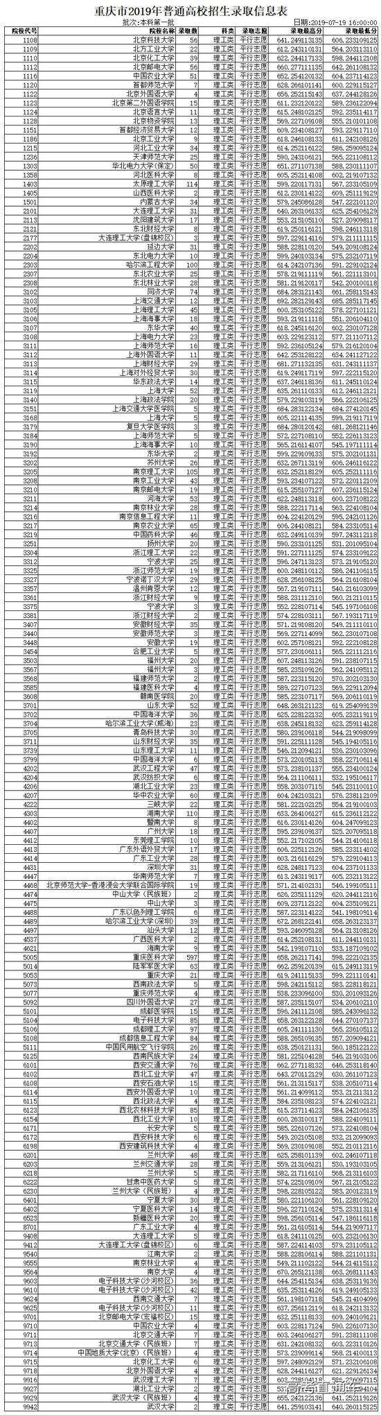 重庆市2019年普通高校招生录取信息表(本科第一批理工类)