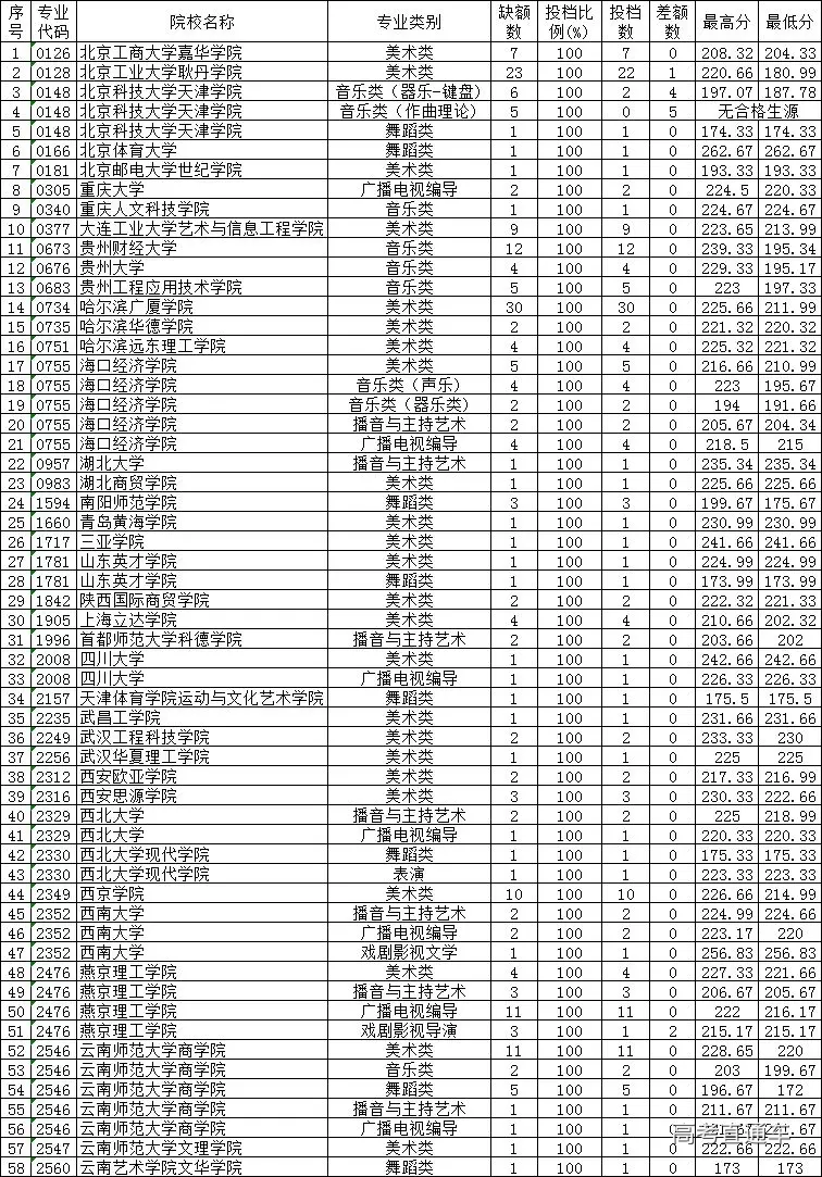 贵州省2019年高考艺术类平行志愿本科院校第2次补报志愿投档情况