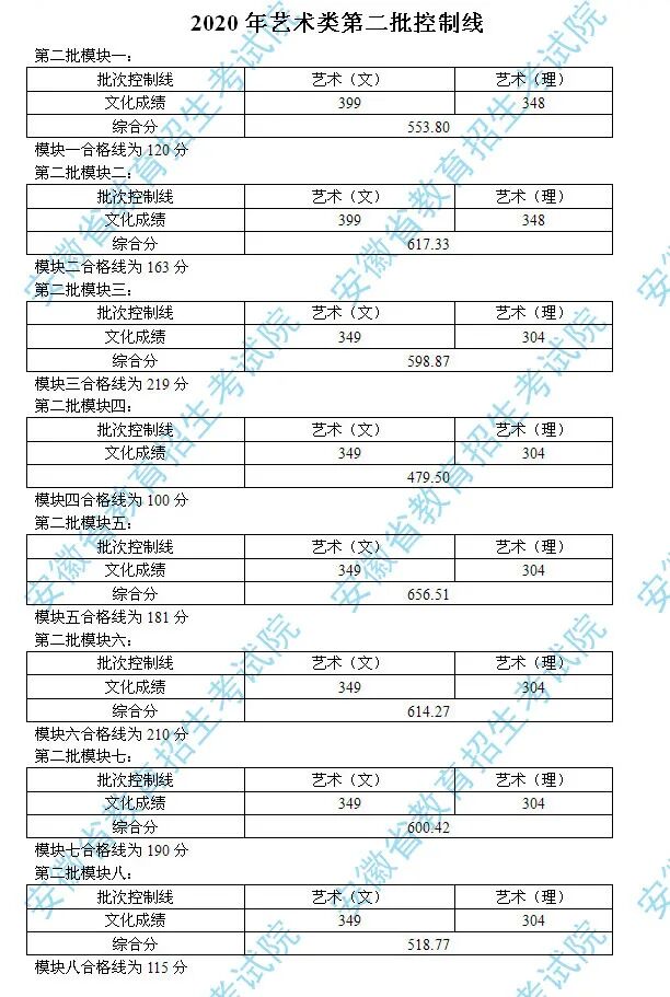 安徽2020年艺术类第二批控制线