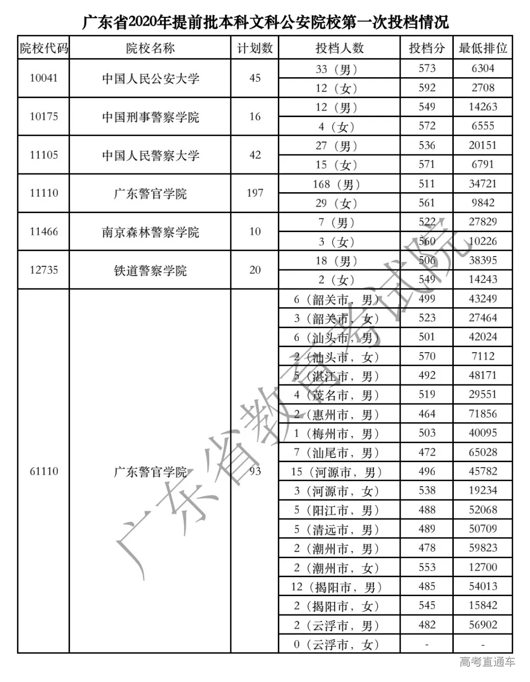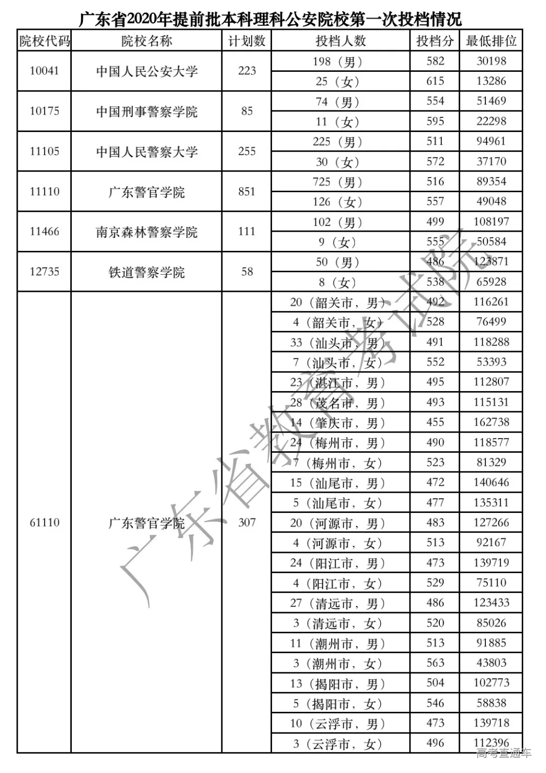 8月9日,省招生办对提前批公安院校开始投档录取,共投出2304人,其中文科类投出414人,理科类投出1890人。今年为保证公安人才的选拔,体现优生优录,我省将公安类专业单列一个批次,放在军检院校后投档,实行平行志愿,进一步增加高分考生被录取的机会。从投档情况看,考生志愿填报十分踊跃,院校生源良好,第一次投档除广东警官学院文科类公安专项计划尚有个别地区专业缺额外,其他院校均满档,且投档分数较高,远超本科线。中国人民公安大学、中国刑事警察学院最受广大考生欢迎,其中,中国人民公安大学文科类最低投档分数线达到男生573分、女生592分,理科类达到男生582分、女生615分;中国刑事警察学院文科类最低投档分数线达到男生549分、女生572分,理科类达到男生554分、女生595分。