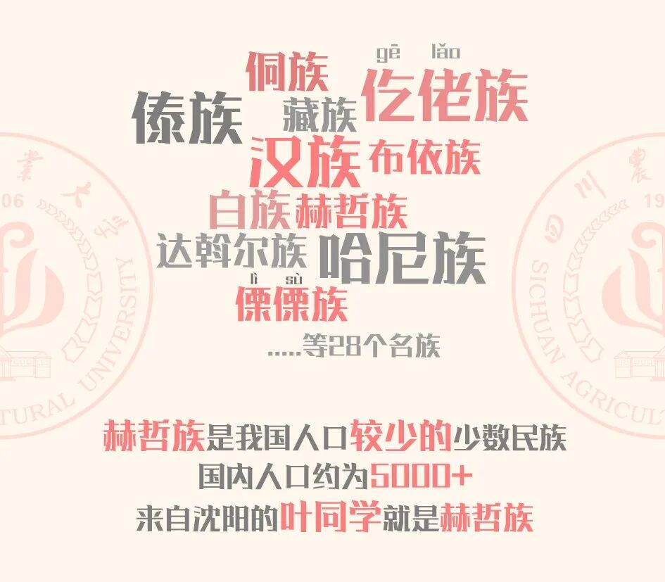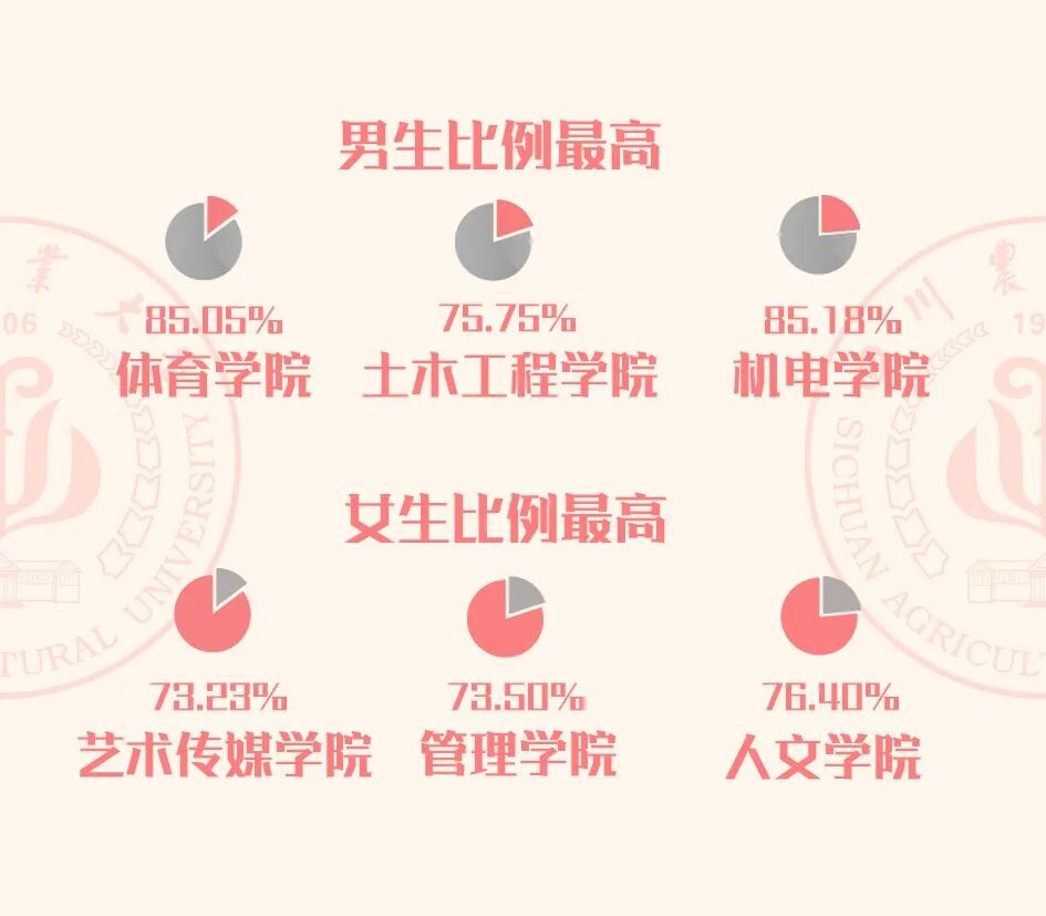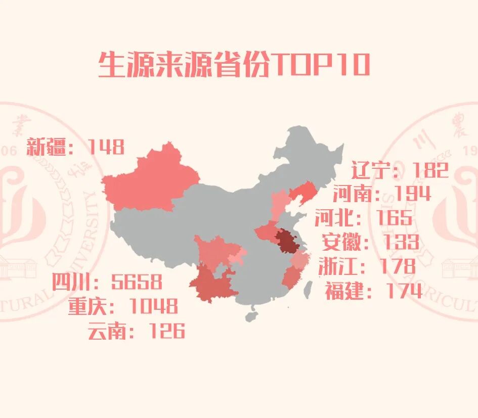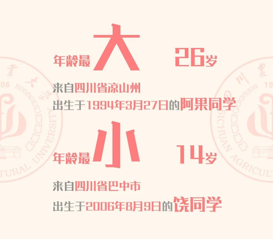 2020年,川农共录取本科新生9315人。其中成都校区3627人,雅安校区4188人,都江堰校区1500人。 最受关注的当时是男女比例啦!今年本科新生中,男生4361人,女生4954人,总体比例为1:1.14,仍是女生多于男生(男同胞们抓住机会!)。 机电学院是男生比例最高的学院,其次是体育学院和土木工程学院。他们成功突出重围,担起了今年本科新生男生的大旗。 女生比例最高的学院依次是人文学院、管理学院和艺术与传媒学院。这三个学院的男生们,上课可不准分心哦! 今年入学的本科新生中,有21位小萌新在川农校庆日9月6日过生日,这是怎样的一种缘分! 8月,10月,11月是萌新们出生日期分布最密集的三个月份,这三个月,生日礼物可得提前准备! 在报到日的这三天过生日的同学有88人,祝你们生日快乐,开学快乐! 20级新生中,年龄最大的26岁,最小的14岁。 20级萌新中,最常见的姓氏是李。 今年加入我们川农这个大家庭的萌新中,来源人数最多的省份是四川省,其次是重庆市、河南省、辽宁省、浙江省等等。 小萌新们来自28个不同的民族,除汉族外,还有仡佬族、哈尼族、傣族、傈僳族、侗族、藏族等。 ▲ 小萌新们 大学的旅途已经开启 各位2020级新生及新生家长们: