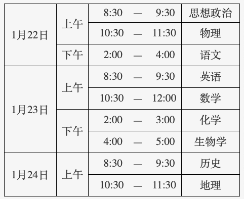 2026年第一次合格考定于明年1月22日至24日进行,考试科目包括语文、数学、外语、思想政治、历史、地理、物理、化学、生物学,各科满分均为100分。