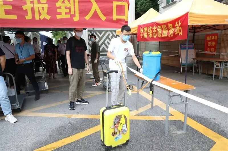 广西师范大学要求2020级新生报到前,每日向学校上报本人健康信息,连续14天身体健康持绿码,才被允许入校。学生入校前5日要做好到校规划,并通过学校系统填报入校信息。 来校途中,学生须按之前填报的乘车时间、车次到站。学生抵达桂林后需乘坐“点对点”定制专线公交车、出租车或网约车到校,来自中高风险地区学生可乘坐返校专车到校。 随同学生的家长、亲戚、朋友等不得进入校园。 ▲新生报到,现场对行李进行消杀。图片来源:广西医科大学官方微信