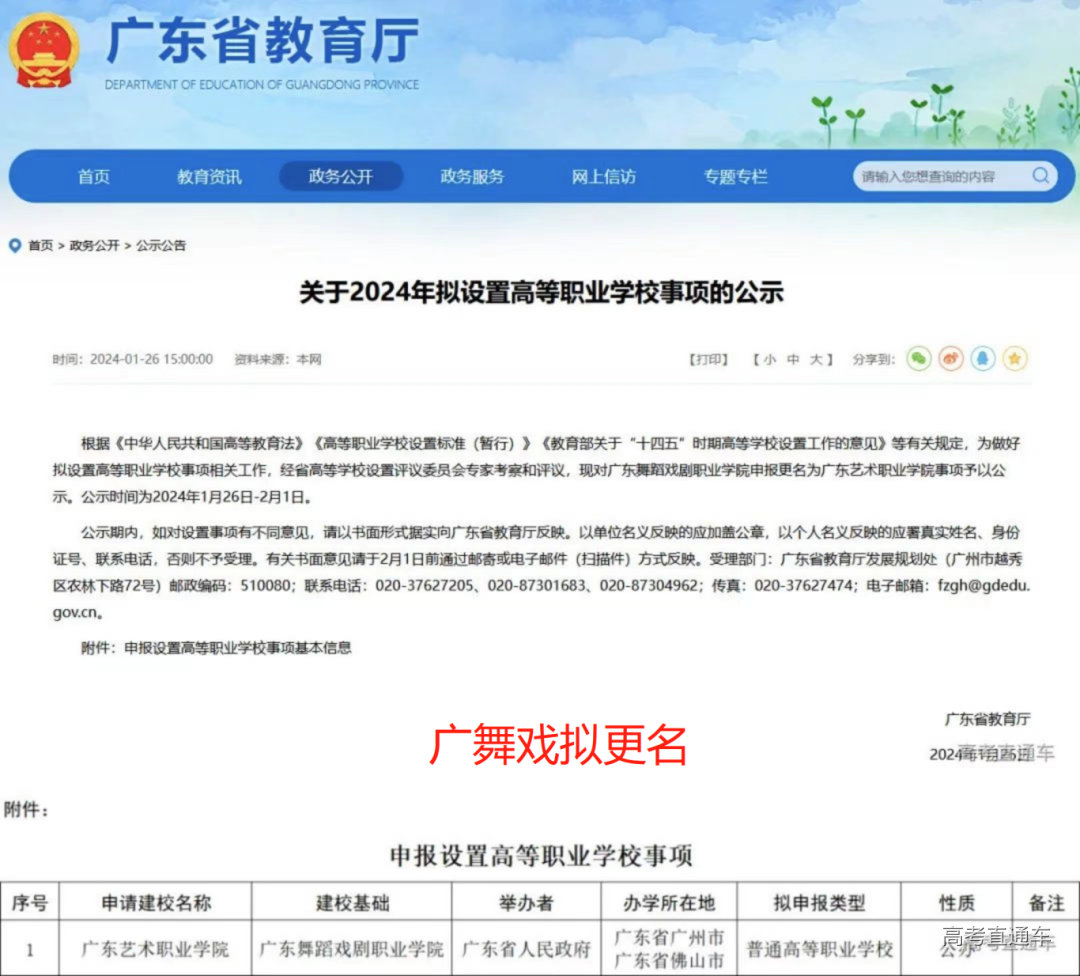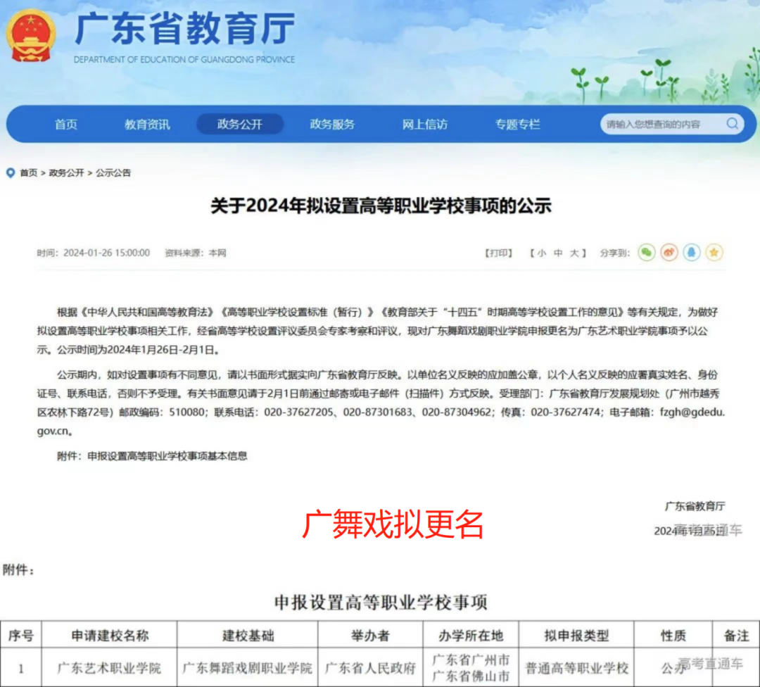 2024年1月,广东省教育厅官宣:广东舞蹈戏剧职业学院拟更名为“广东艺术职业学院”。
