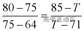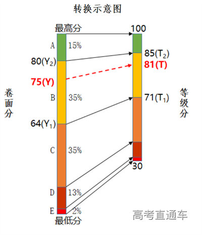 例如,假设某同学化学学科卷面分为75分,按照卷面分排序,等级比例应划分到B等级,而该学科B等级的卷面分分布区间为80~64,等级分区间为85~71,按照转换公式: