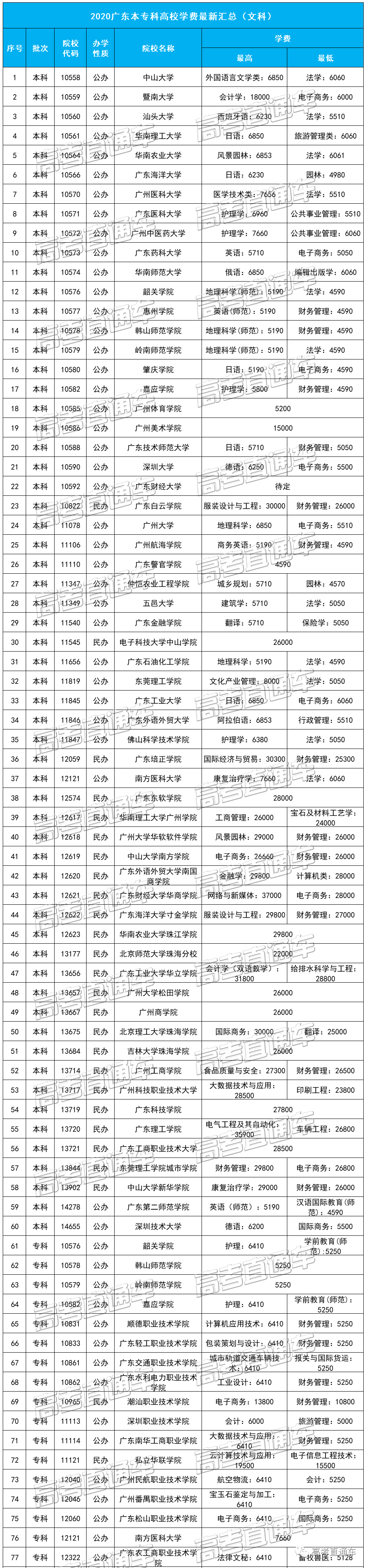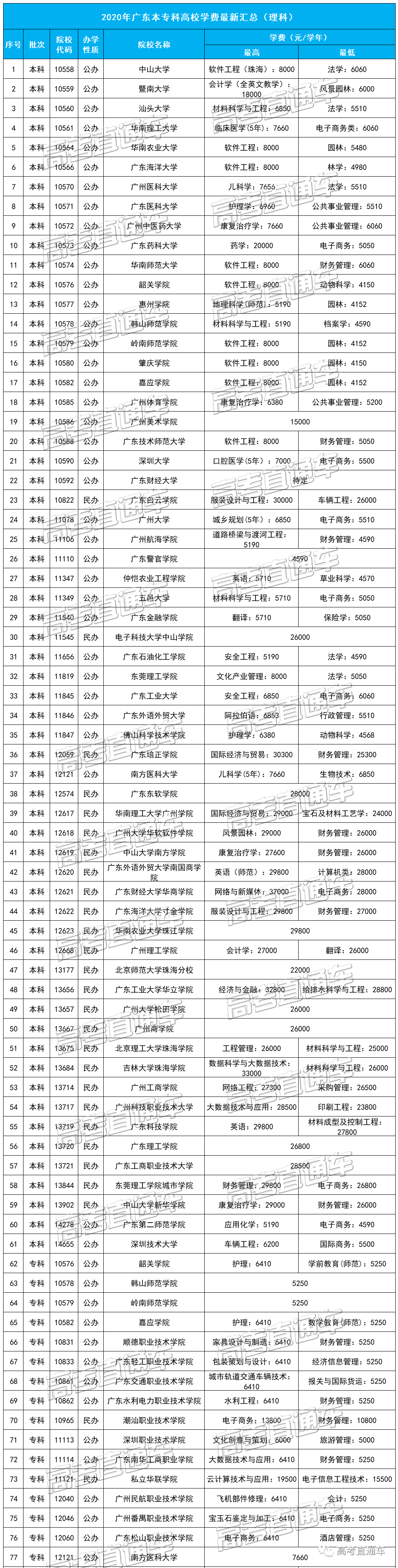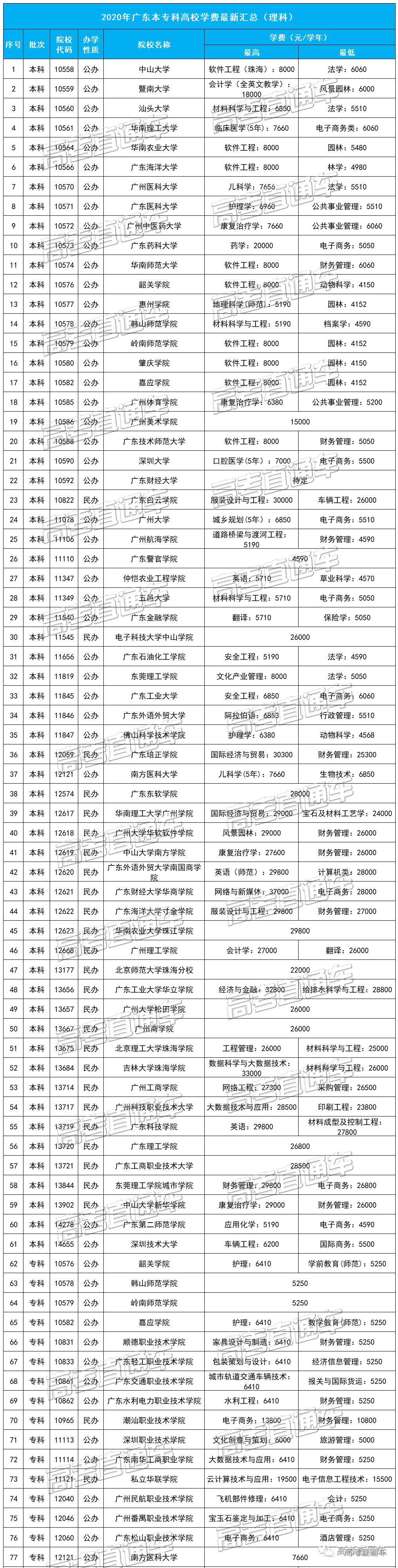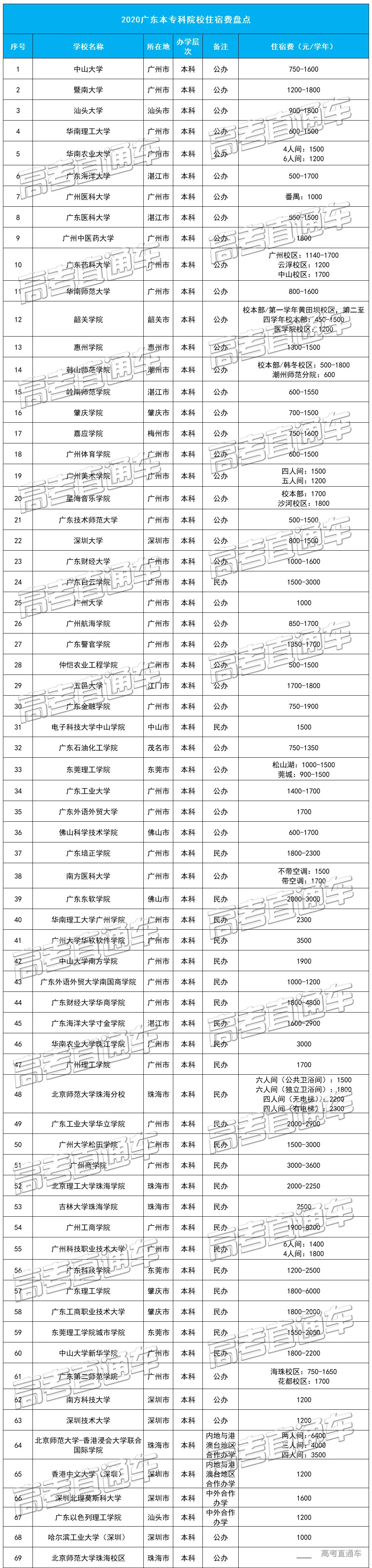 完成2021高考报名的同学们,心里是否有目标院校了呢?在选择院校时,相信不少同学都很关注学校的学费和住宿费如何、是公办还是民办、有哪几个校区等等问题。 今天高考直通车就来给大家一一介绍一下广东各高校2020年的学费和住宿费以及校区情况,快来了解一下你的目标院校情况如何吧! 该学费盘点不包括中外合作办学专业、特殊类招生、校企合作、协同培养、国际班等。由于很多学校都会有多个专业相同学费,所以只列举其中一个专业。 本文盘点的各校学费来源于广东省2020年普通高等学校招生专业目录,如有数据错漏,请在留言区告诉我们。表格只盘点普通文理类专业的基本情况,最终各专业学费请以院校或考试院公布的招生目录为准。 另外要注意的是,从2019年起李嘉诚基金会在汕头大学设立本科生学费全额奖励计划,对今年入读汕头大学的每一位新生,四年全部学费以奖励的形式返给学生,所以相当于入读汕头大学的本科生是免学费的。 另外,广东碧桂园职业学院为贫困生减免学费、食宿费、教材费、服装费、床上用品费、学习用品费及寒暑假往返路费,非贫困生全额奖励学费、住宿费,所以这所学校也是免费的。 广东省各批次公办院校学费基本在4000-7000,近年涨幅不大;而独立学院或民办学院普遍20000+才读得起。 公办高校的学费依旧秉持着低于民办高校、中外合作办学高校、内地与港澳台地区合作办学高校的规律。 除此之外,学费最高的当属中外合作办学高校以及内地与港澳台地区合作办学的高校,第一名为北京师范大学-香港浸会大学联合国际学院的音乐表演专业,108000元/生/年。 其中,下列专业类型收费较贵: 1、实行中外联合办学培养的专业,如暨大伯明翰大学联合学院专业:70000元/生/学年。 2、学分互认专业(1+3或2+2模式)。 3、校企合作特色班,如广东工商职业技术大学的校企合作特色班专业达34300元/年。 4、艺术类专业收费较高,普遍在10000元/学年,音乐表演专业最高达108000元/生/年。 占据榜单前十的主要专业类型为:金融类、软件工程、生化技术类、数学与大数据类、媒体艺术类等专业。 说明:本文表格数据整理自各高校招生章程或招生专业目录,不含专项计划、中外合作办学或境外合作办学等特殊专业,仅供参考,由于可能存在不同住宿条件和专业等,具体住宿费有所不同,最终请以高校最新规定为准。 本表“——”表示暂无数据。要注意的是,广东碧桂园职业学院是慈善公益性质的高等学校,对家庭经济困难学生实行全额资助,对非家庭经济贫困学生提供全额奖学金。全额奖学金按照考生所在专业学费标准与住宿费标准进行奖励,奖学金获得率在入学第一年为100%,所有新生都可获得;在入学后第二、三年将依据学生在校综合表现,由学生申请获得,如全体学生都表现良好,100%学生都可获得全额奖学金。 广东本专科院校中住宿费最贵的当属广州工商学院,住宿费最高竟达8200元/学年。其次是北京师范大学-香港浸会大学联合国际学院的两人间宿舍费,高达6400元/学年,排名第三的是广东理工学院,住宿费最高达6000元/学年。 同样,住宿费较高的还有广东财经大学华商学院(最高4800元/学年)、广州商学院(3600元/学年)、北京师范大学-香港浸会大学联合国际学院(三人间4000元/学年、四人间3500元/学年)、广州大学华软软件学院(3500元/学年)、华南农业大学珠江学院(3000元/学年)、广东酒店管理职业技术学院(最高3200元/学年)、广州大学松田学院(最高3000元/学年)、广州康大职业技术学院(3000元/学年)等。 其实,部分院校对于不同的校区、不同的宿舍环境宿舍收费会有所区别,比如北京师范大学珠海分校,是按有无独立卫浴间、有无电梯来制定收费标准。 从上表可知,公办院校住宿费普遍在900-2000元/学年,民办院校住宿费普遍在1500-3000元/学年。虽然民办院校的住宿费大部分都高于公办院校,但相应的住宿环境也是要好一点的。而中外合作办学院校的住宿费普遍维持在1200-1600元/学年。 据表格不完全统计,广州市无疑是广东省内最多大学的城市。至少有135个高校/校区在广州市,其次是深圳市至少有17个大学/校区,佛山市至少有15个,东莞市至少11个,湛江市至少10个,珠海市至少9个等。 ▲鸟瞰广州大学城 ▲广东医科大学校区分布示意图 ▲华南农业大学校园 你的目标院校是哪一所呢?评论说说看吧!