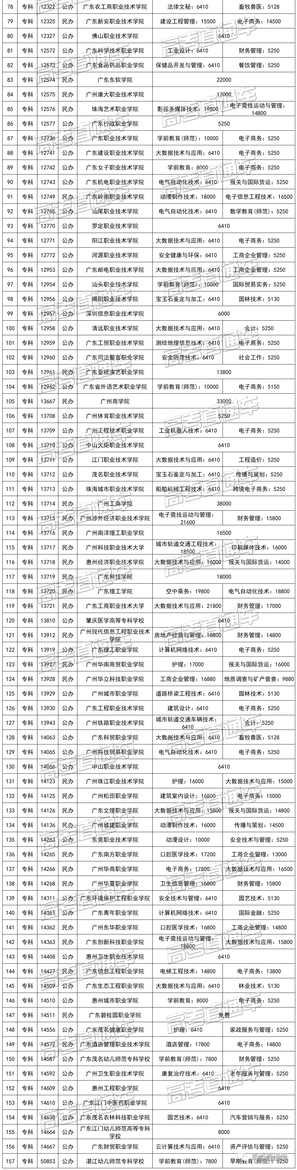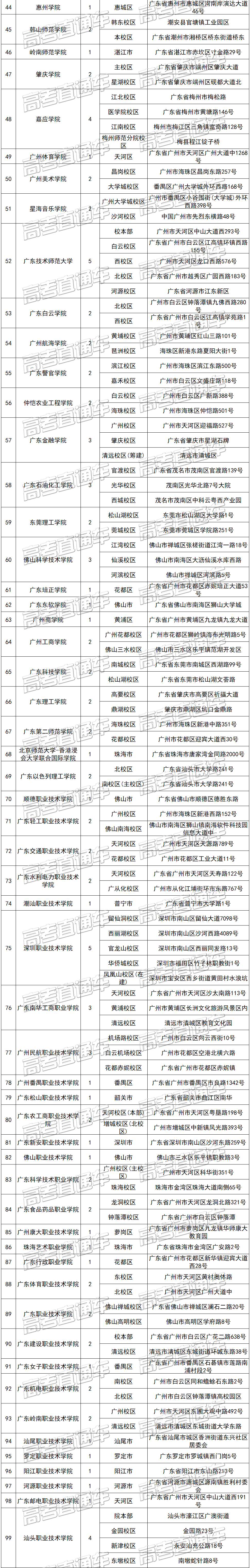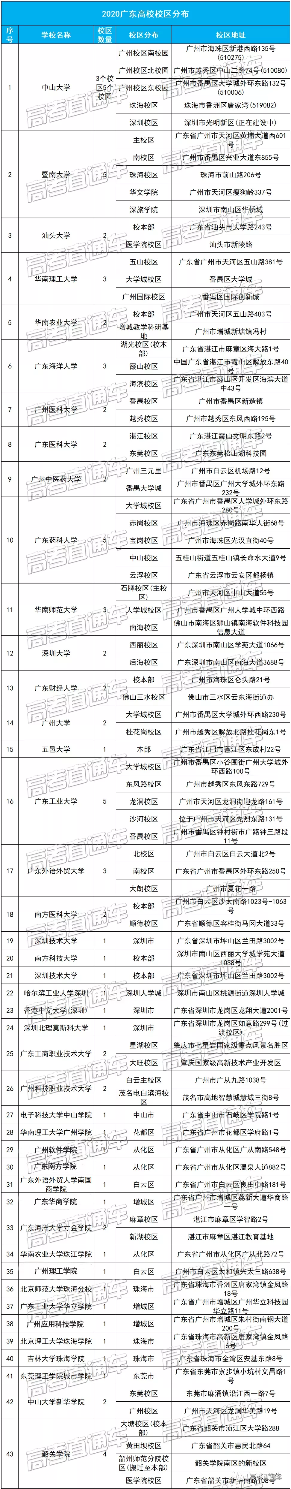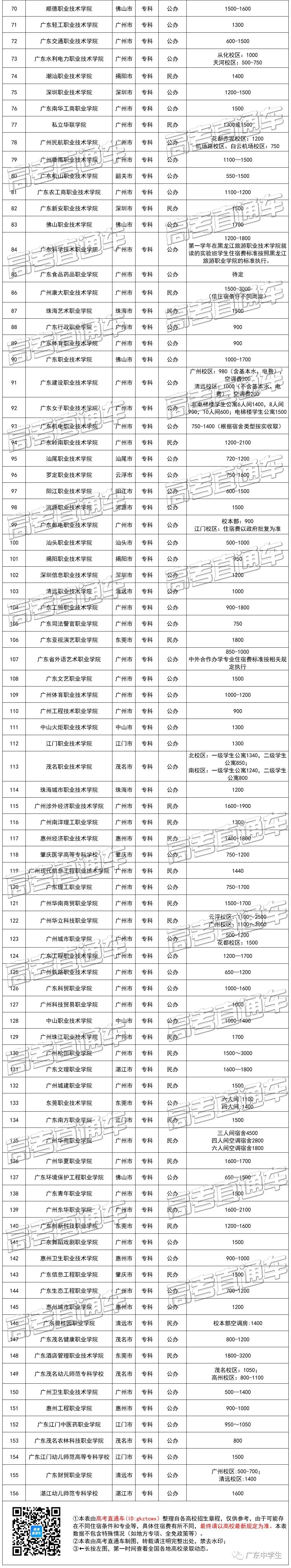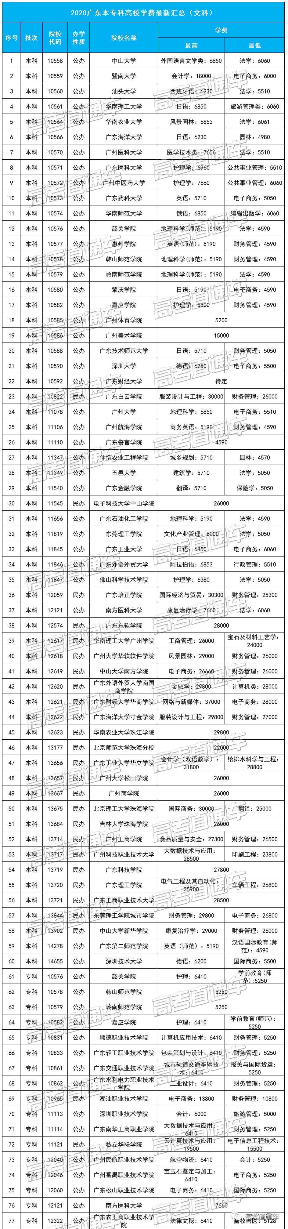 完成2021高考报名的同学们,心里是否有目标院校了呢?在选择院校时,相信不少同学都很关注学校的学费和住宿费如何、是公办还是民办、有哪几个校区等等问题。 今天高考直通车就来给大家一一介绍一下广东各高校2020年的学费和住宿费以及校区情况,快来了解一下你的目标院校情况如何吧! 该学费盘点不包括中外合作办学专业、特殊类招生、校企合作、协同培养、国际班等。由于很多学校都会有多个专业相同学费,所以只列举其中一个专业。 本文盘点的各校学费来源于广东省2020年普通高等学校招生专业目录,如有数据错漏,请在留言区告诉我们。表格只盘点普通文理类专业的基本情况,最终各专业学费请以院校或考试院公布的招生目录为准。 另外要注意的是,从2019年起李嘉诚基金会在汕头大学设立本科生学费全额奖励计划,对今年入读汕头大学的每一位新生,四年全部学费以奖励的形式返给学生,所以相当于入读汕头大学的本科生是免学费的。 另外,广东碧桂园职业学院为贫困生减免学费、食宿费、教材费、服装费、床上用品费、学习用品费及寒暑假往返路费,非贫困生全额奖励学费、住宿费,所以这所学校也是免费的。 广东省各批次公办院校学费基本在4000-7000,近年涨幅不大;而独立学院或民办学院普遍20000+才读得起。 公办高校的学费依旧秉持着低于民办高校、中外合作办学高校、内地与港澳台地区合作办学高校的规律。 除此之外,学费最高的当属中外合作办学高校以及内地与港澳台地区合作办学的高校,第一名为北京师范大学-香港浸会大学联合国际学院的音乐表演专业,108000元/生/年。 其中,下列专业类型收费较贵: 1、实行中外联合办学培养的专业,如暨大伯明翰大学联合学院专业:70000元/生/学年。 2、学分互认专业(1+3或2+2模式)。 3、校企合作特色班,如广东工商职业技术大学的校企合作特色班专业达34300元/年。 4、艺术类专业收费较高,普遍在10000元/学年,音乐表演专业最高达108000元/生/年。 占据榜单前十的主要专业类型为:金融类、软件工程、生化技术类、数学与大数据类、媒体艺术类等专业。 说明:本文表格数据整理自各高校招生章程或招生专业目录,不含专项计划、中外合作办学或境外合作办学等特殊专业,仅供参考,由于可能存在不同住宿条件和专业等,具体住宿费有所不同,最终请以高校最新规定为准。 本表“——”表示暂无数据。要注意的是,广东碧桂园职业学院是慈善公益性质的高等学校,对家庭经济困难学生实行全额资助,对非家庭经济贫困学生提供全额奖学金。全额奖学金按照考生所在专业学费标准与住宿费标准进行奖励,奖学金获得率在入学第一年为100%,所有新生都可获得;在入学后第二、三年将依据学生在校综合表现,由学生申请获得,如全体学生都表现良好,100%学生都可获得全额奖学金。 广东本专科院校中住宿费最贵的当属广州工商学院,住宿费最高竟达8200元/学年。其次是北京师范大学-香港浸会大学联合国际学院的两人间宿舍费,高达6400元/学年,排名第三的是广东理工学院,住宿费最高达6000元/学年。 同样,住宿费较高的还有广东财经大学华商学院(最高4800元/学年)、广州商学院(3600元/学年)、北京师范大学-香港浸会大学联合国际学院(三人间4000元/学年、四人间3500元/学年)、广州大学华软软件学院(3500元/学年)、华南农业大学珠江学院(3000元/学年)、广东酒店管理职业技术学院(最高3200元/学年)、广州大学松田学院(最高3000元/学年)、广州康大职业技术学院(3000元/学年)等。 其实,部分院校对于不同的校区、不同的宿舍环境宿舍收费会有所区别,比如北京师范大学珠海分校,是按有无独立卫浴间、有无电梯来制定收费标准。 从上表可知,公办院校住宿费普遍在900-2000元/学年,民办院校住宿费普遍在1500-3000元/学年。虽然民办院校的住宿费大部分都高于公办院校,但相应的住宿环境也是要好一点的。而中外合作办学院校的住宿费普遍维持在1200-1600元/学年。 据表格不完全统计,广州市无疑是广东省内最多大学的城市。至少有135个高校/校区在广州市,其次是深圳市至少有17个大学/校区,佛山市至少有15个,东莞市至少11个,湛江市至少10个,珠海市至少9个等。 ▲鸟瞰广州大学城 ▲广东医科大学校区分布示意图 ▲华南农业大学校园 你的目标院校是哪一所呢?评论说说看吧!