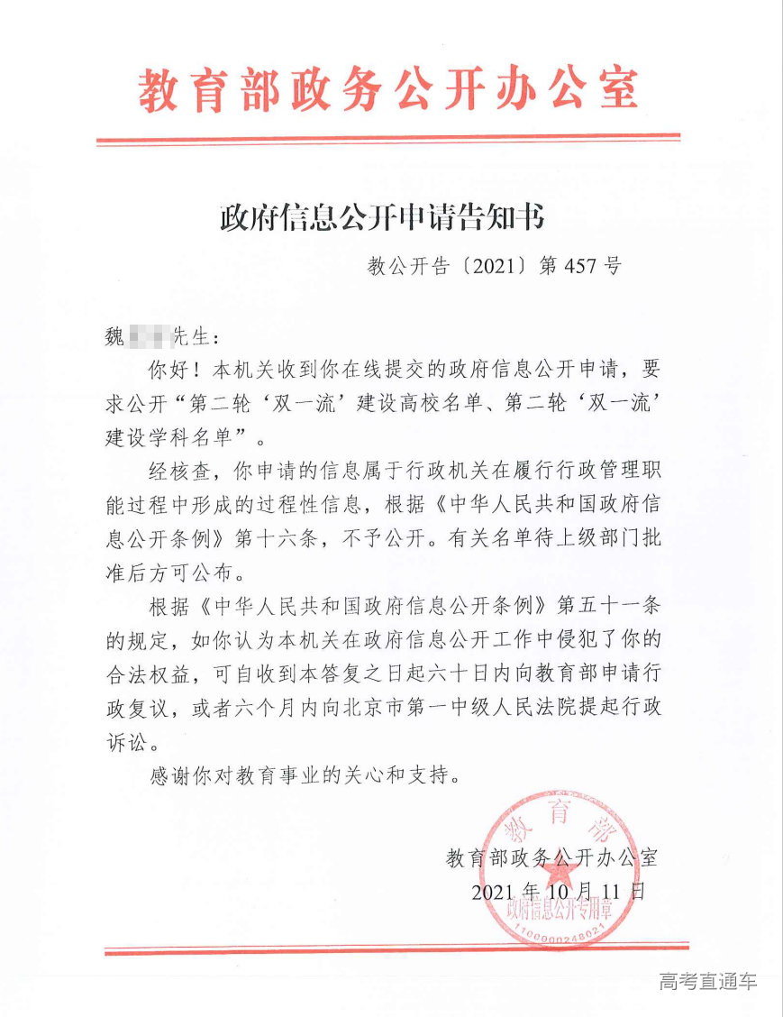 根据魏先生提供的政府信息公开申请告知书(教公开告【2021】第457号),教育部政务公开办公室回复:经核查,你申请的信息属于行政机关在履行行政管理职能过程中形成的过程性信息,根据《中华人民共和国政府信息公开条例》第十六条,不予公开。有关名单待上级部门批准后方可公布。