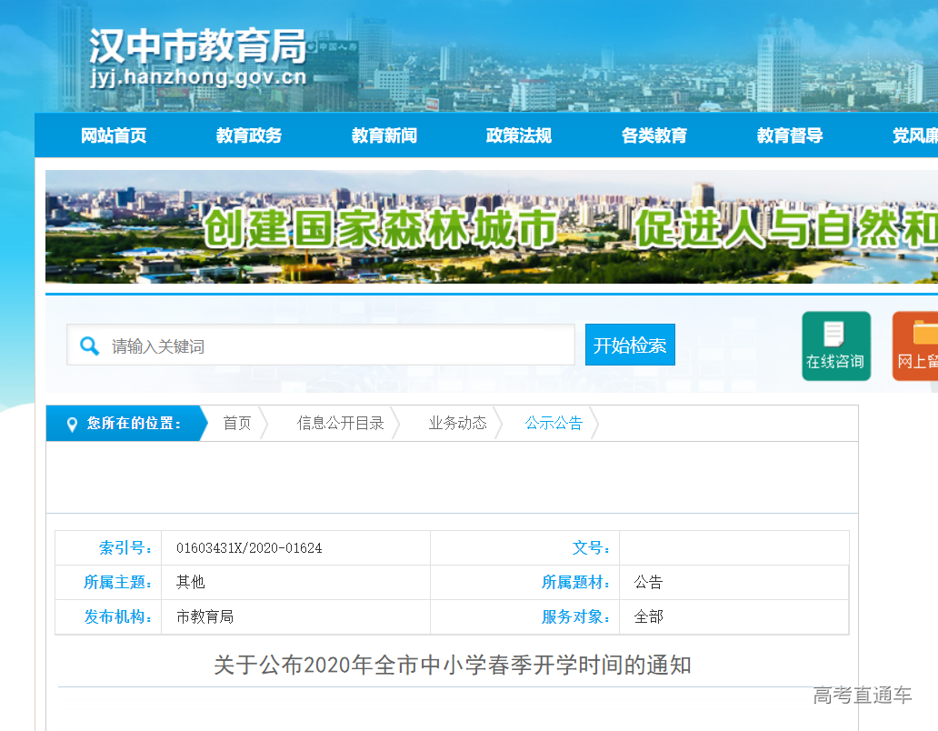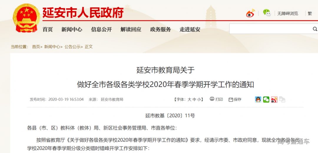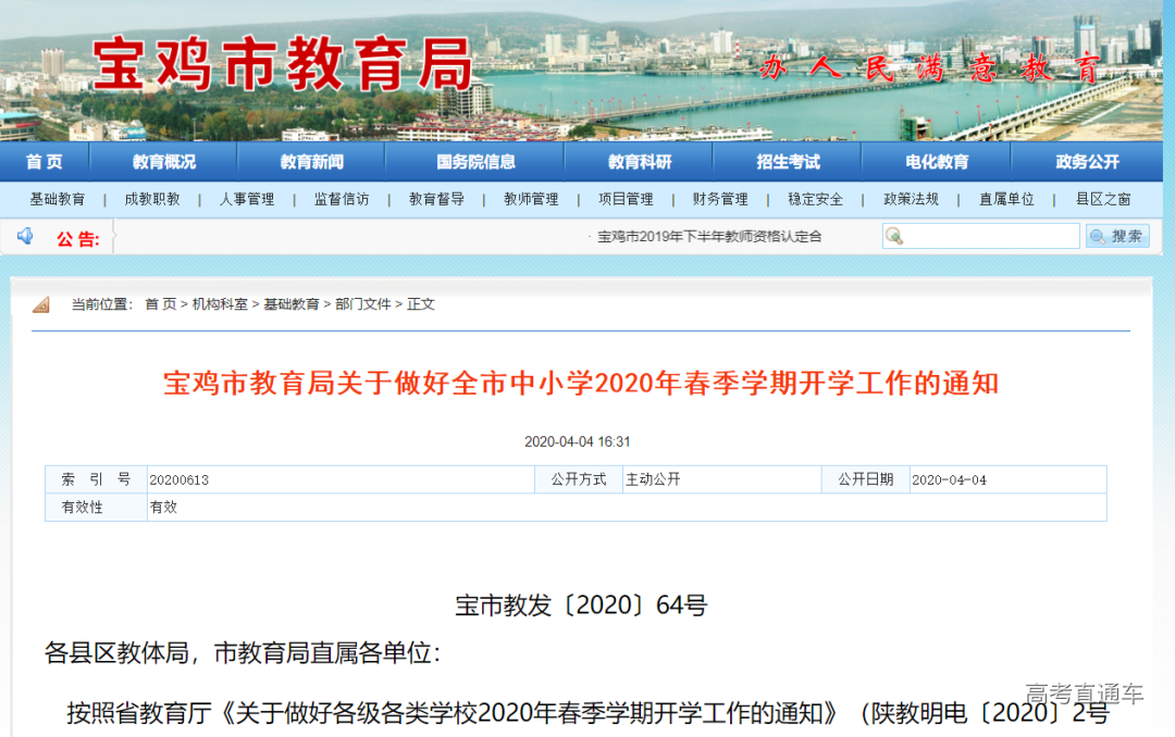 按照《陕西省教育厅关于做好各级各类学校2020年春季学期开学工作的通知》(陕教明电〔2020〕2号)要求,经市委教育工作领导小组研究同意,报省教育厅备案,现就全市小学各年级开学工作通知如下: