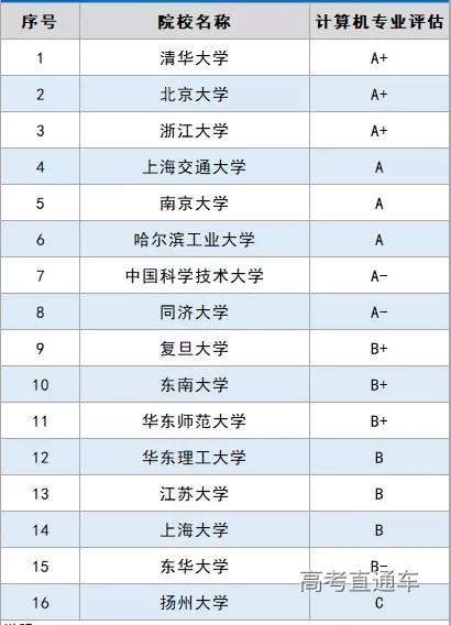 计算机专业A等高校中有3所(上交大、南大、哈工大),A-有2所(中科大、同济)。