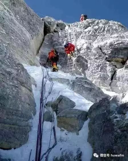 中午 12 点多,4 人来到“第二台阶”,正是这一天险,阻断了众多登山家前进的脚步,是从北坡登顶珠峰过程中最大的难题。