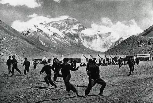 此时,中国登山队却已经做好了一切准备,准备一举登山地球之巅。上图就是当年在登山大本营,队员们开展体育训练的照片。