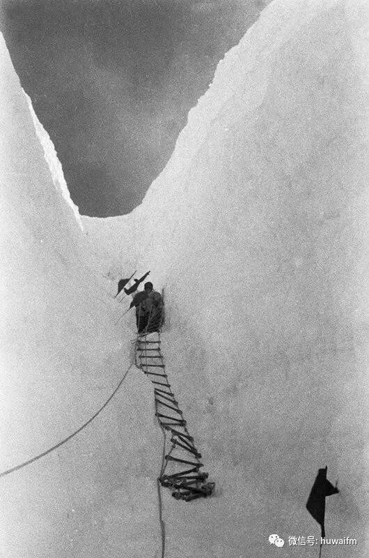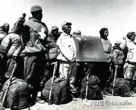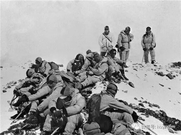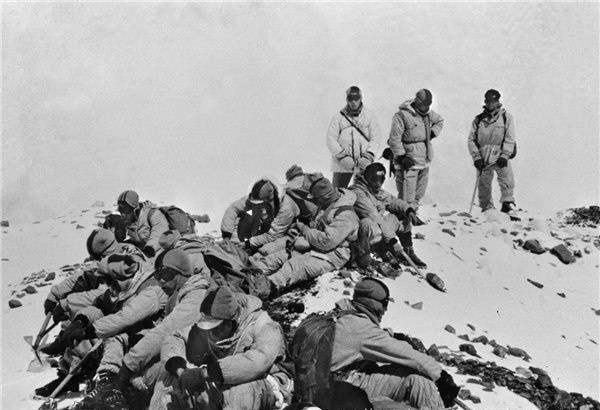 在正式登顶之前,登山队员们先进行过三次高山行军,一方面为适应高山环境并选拔登顶队员,一方面也运送一部分物资到更高的营地,这张照片就是在行军中暂时休息的登山队员们。