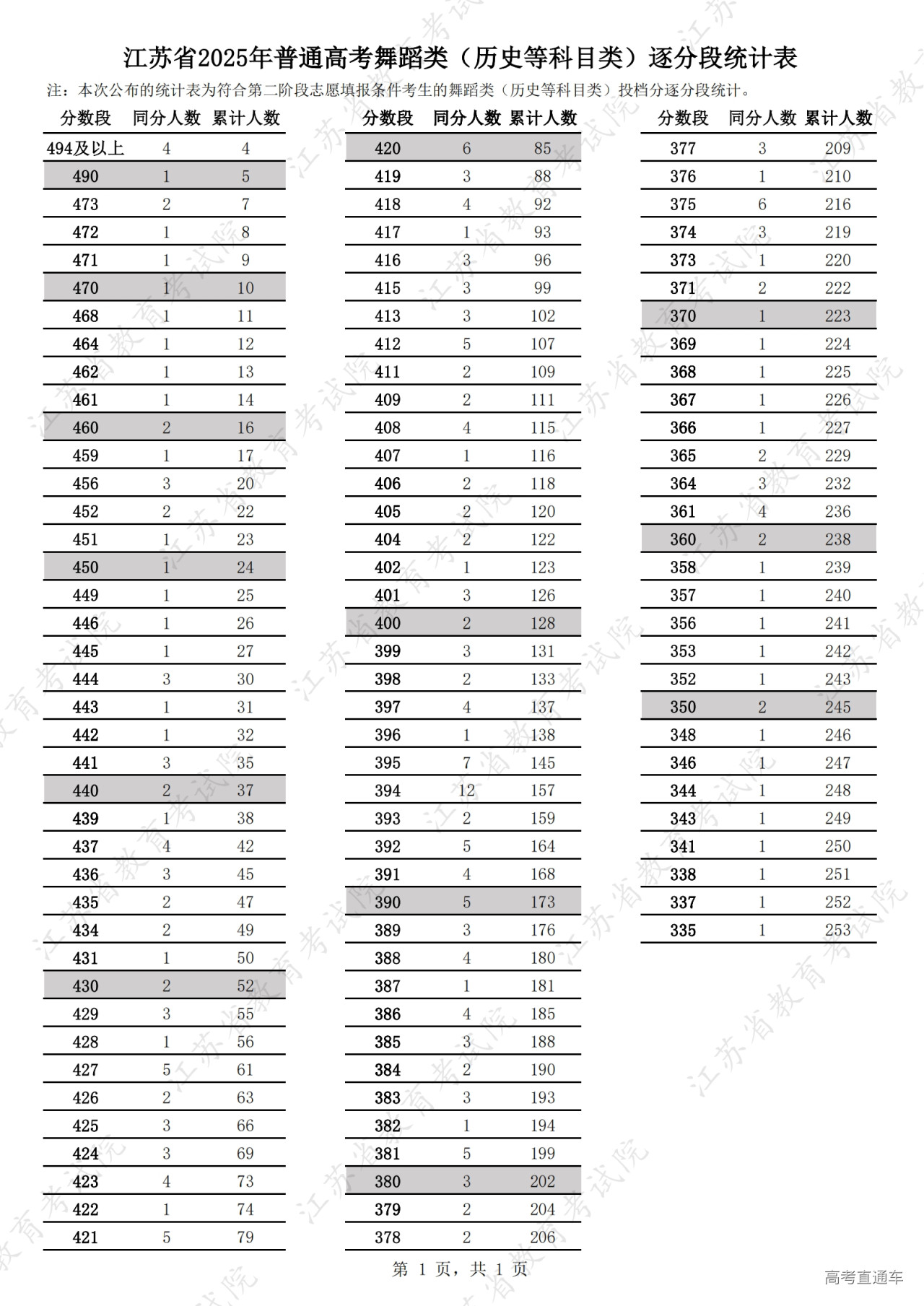 江苏2025普通高考第二阶段逐分段统计表(舞蹈类历史)