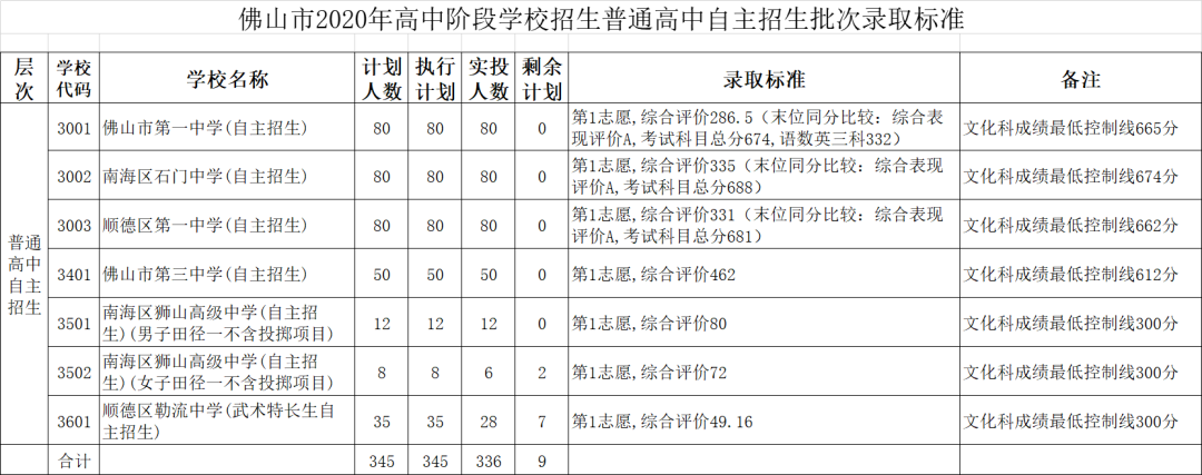 根据《佛山市2020年普通高中自主招生试点工作意见》(佛教招〔2020〕11号)的要求,2020年佛山市高中阶段学校招生普通高中自主招生批次录取标准如下: