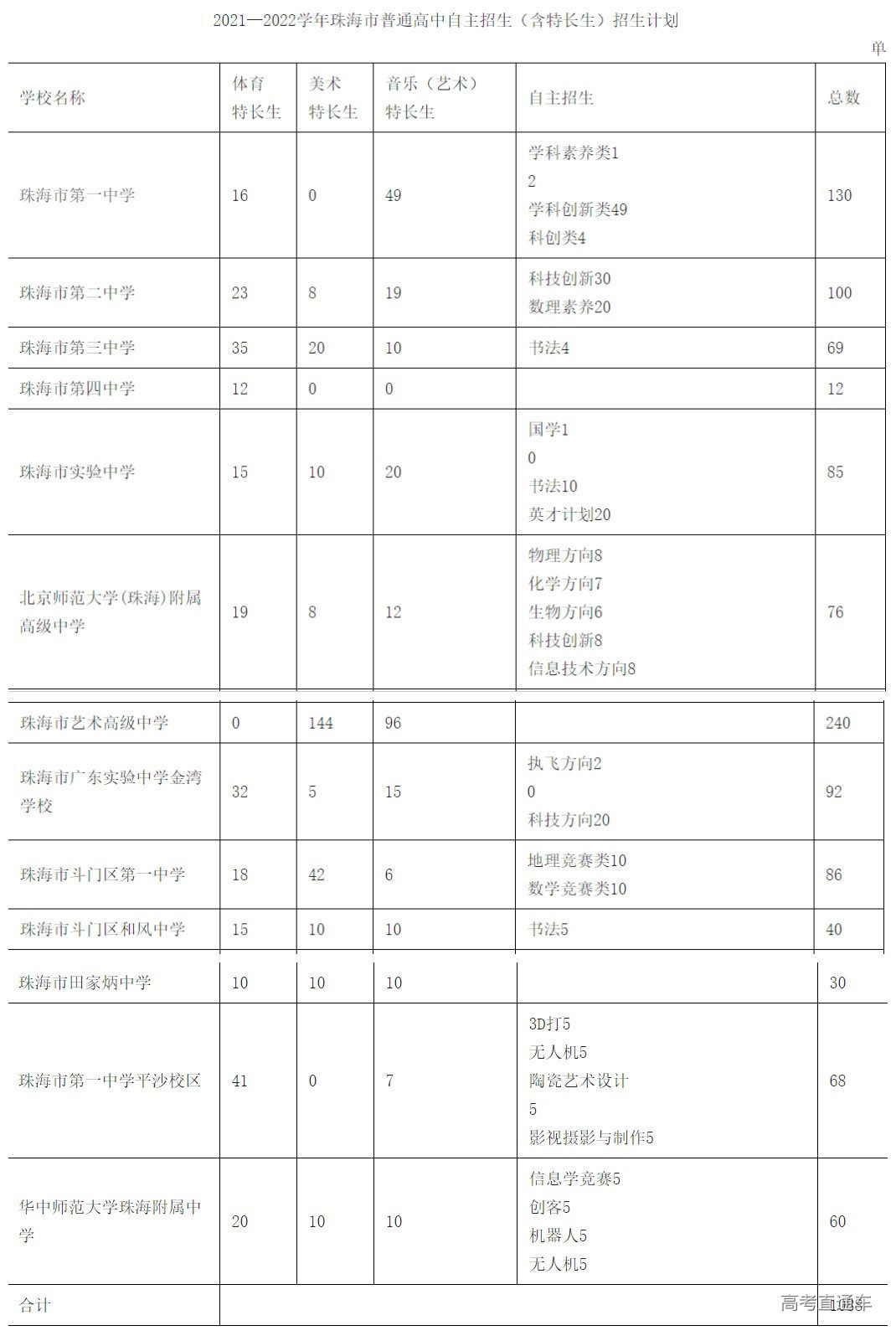 近日,珠海市教育局发布2021—2022学年珠海市普通高中自主招生(含特长生)招生计划。