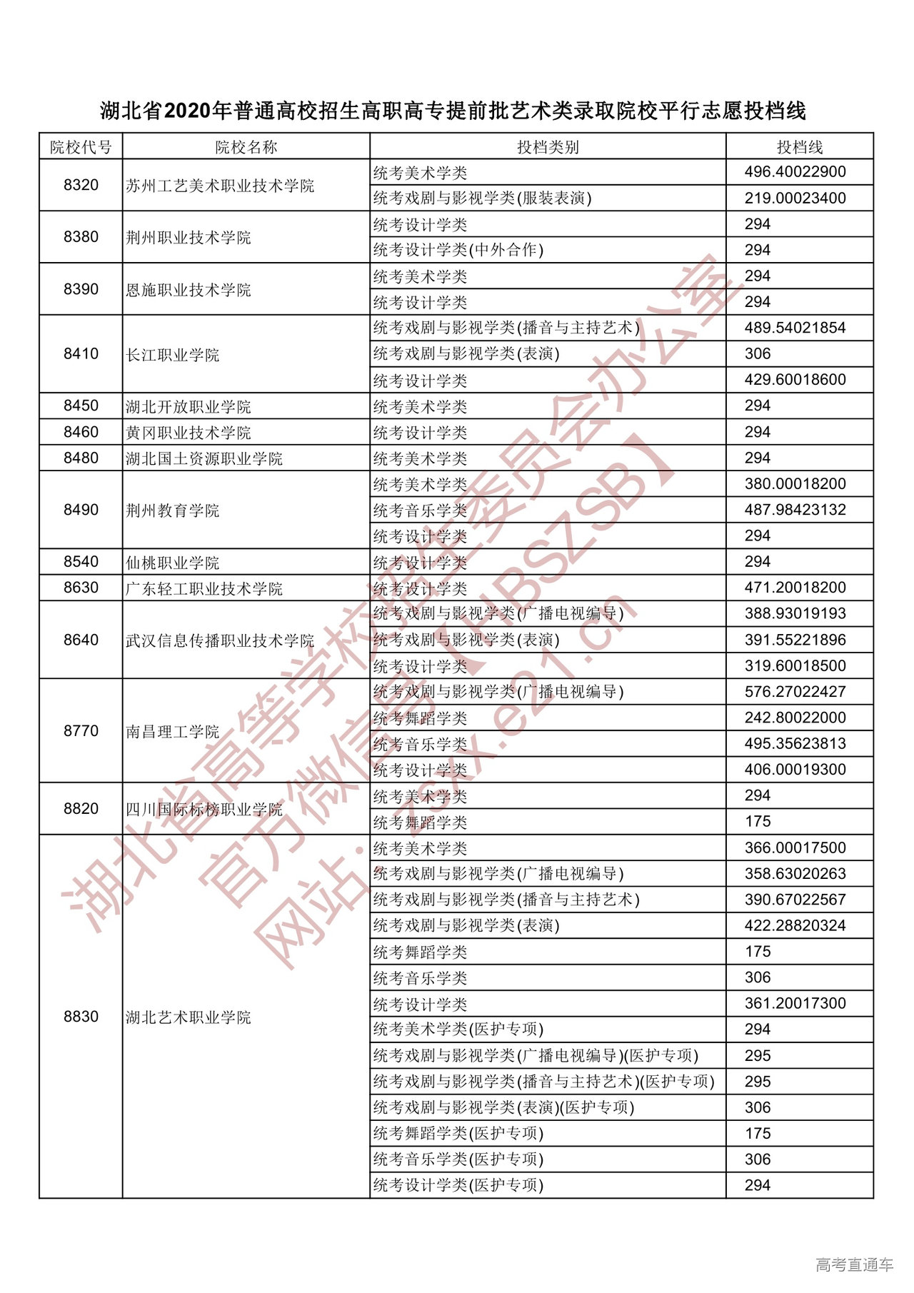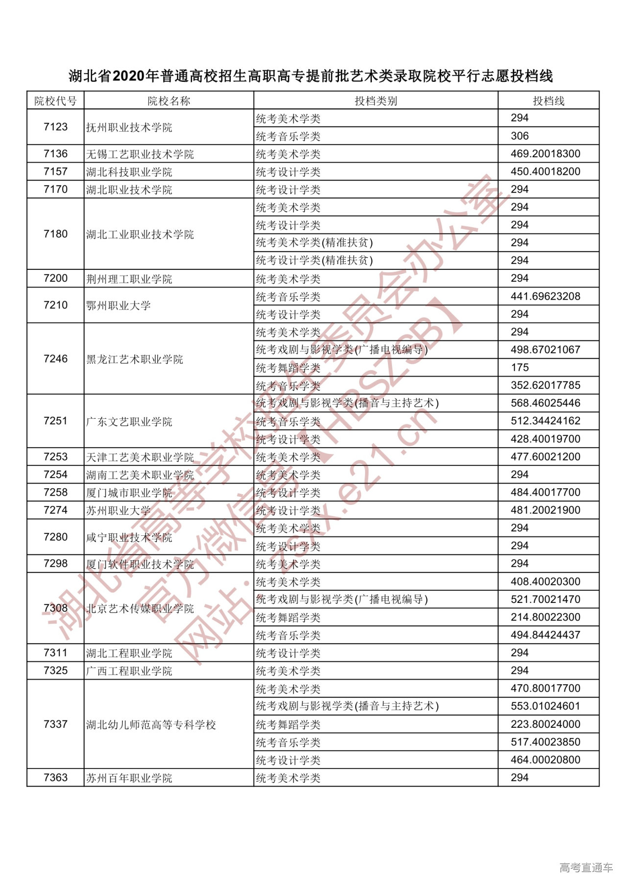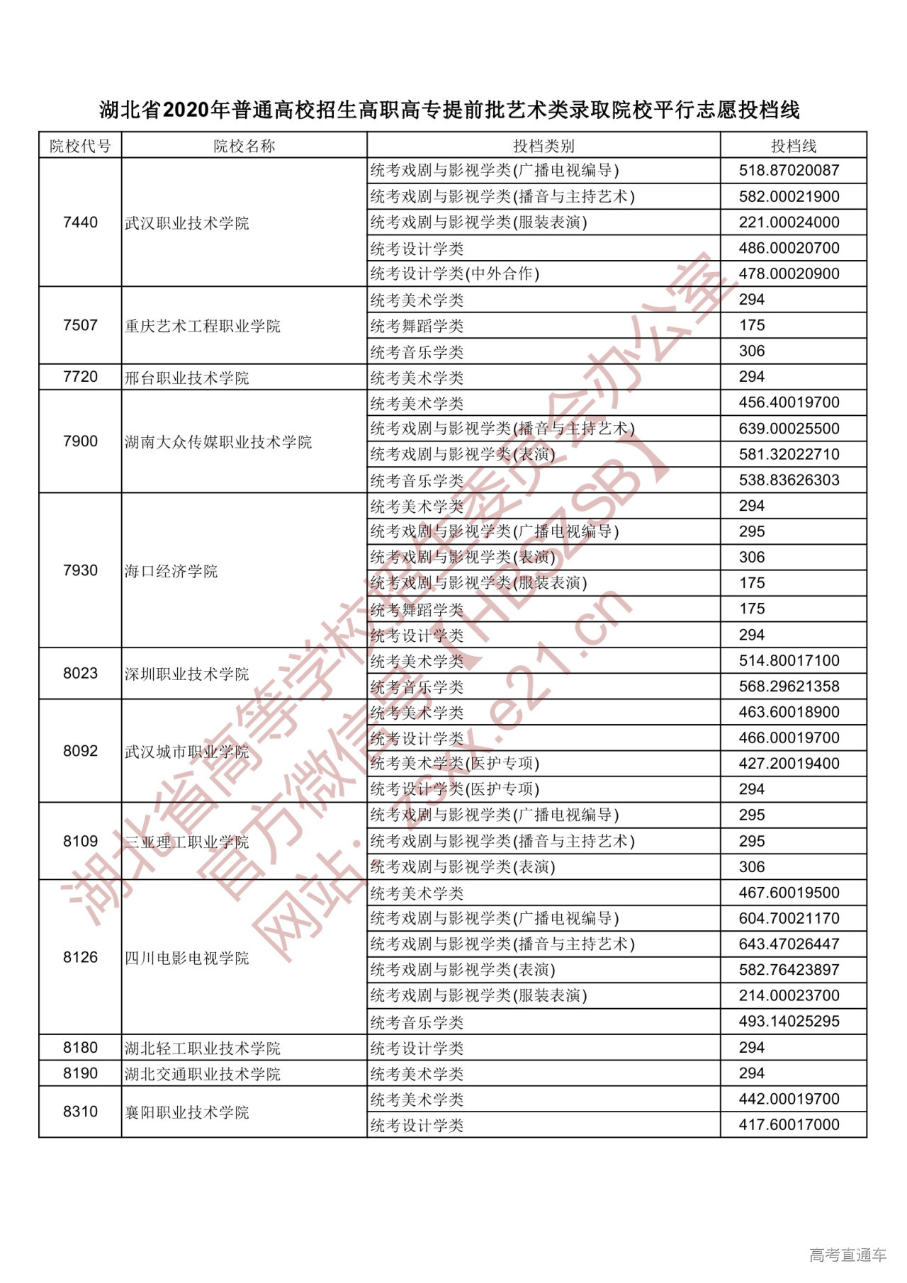 湖北省2020年普通高校招生高职高专提前批艺术类录取院校平行志愿投档线