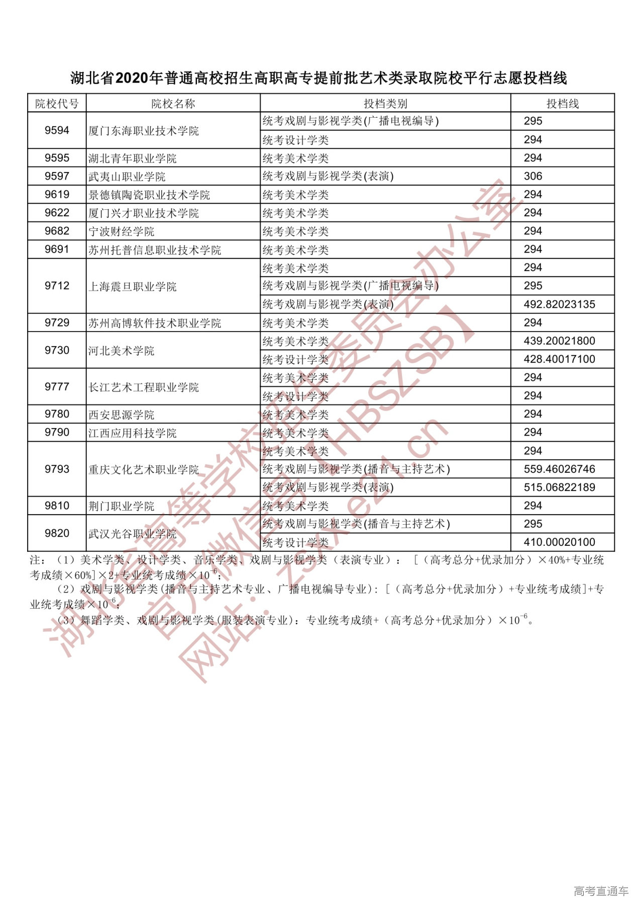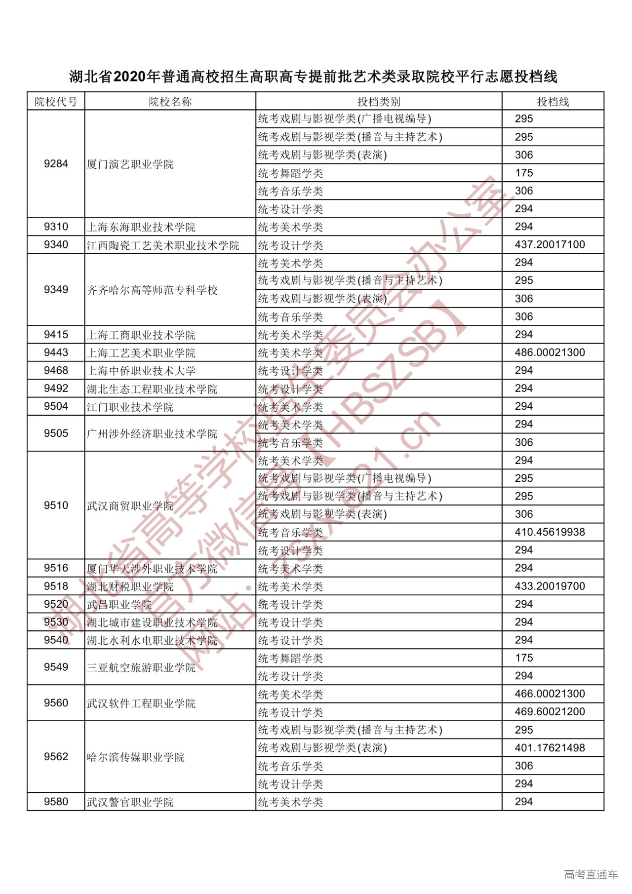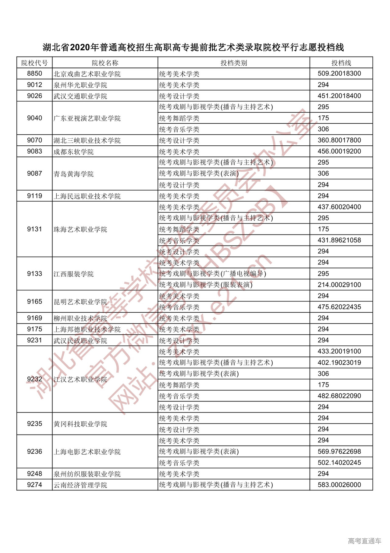 湖北省2020年普通高校招生高职高专提前批艺术类录取院校平行志愿投档线