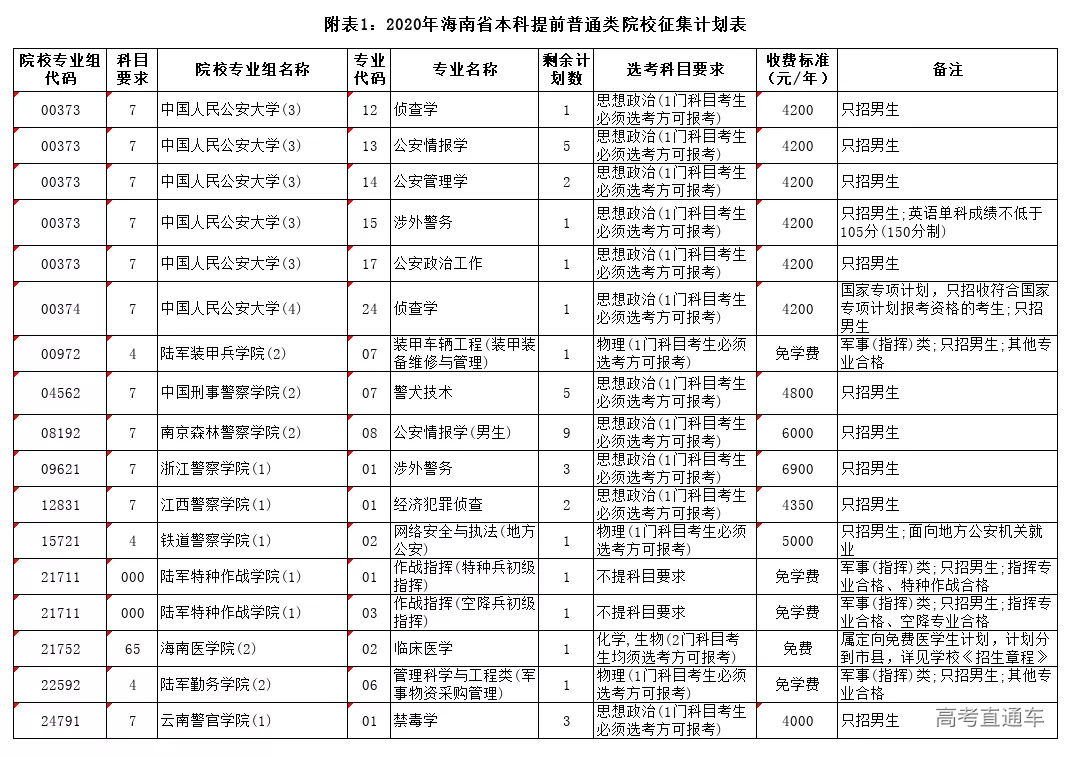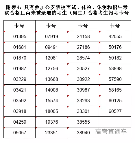 (2)只有参加公安院校面试、体检、体测和招生考察合格且尚未被录取的考生(男生)(合格考生报考卡号见附表4),才能填报(00373)中国人民公安大学(3)、(00374)中国人民公安大学(4)(国家专项计划)、(04562)中国刑事警察学院(2)、(08192)南京森林警察学院(2)、(09621)浙江警察学院(1)、(12831)江西警察学院(1)、(15721)铁道警察学院(1)及(24791)云南警官学院(1)等7所尚有剩余计划的院校专业组和专业志愿。