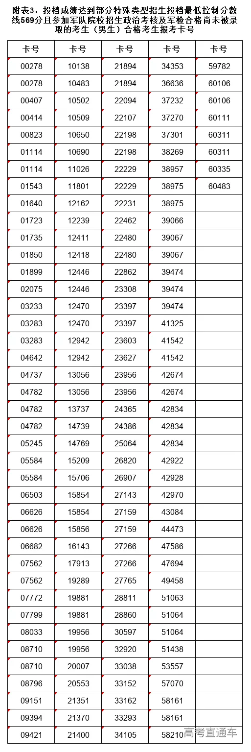 (1)投档成绩达到部分特殊类型招生投档最低控制分数线569分且参加军队院校招生政治考核及军检合格尚未被录取的考生(男生)(合格考生报考卡号见附表3),才能填报(00972)陆军装甲兵学院(2)、(21711)陆军特种作战学院(1)及(22592)陆军勤务学院(2)等3所尚有剩余计划的院校专业组和专业志愿。