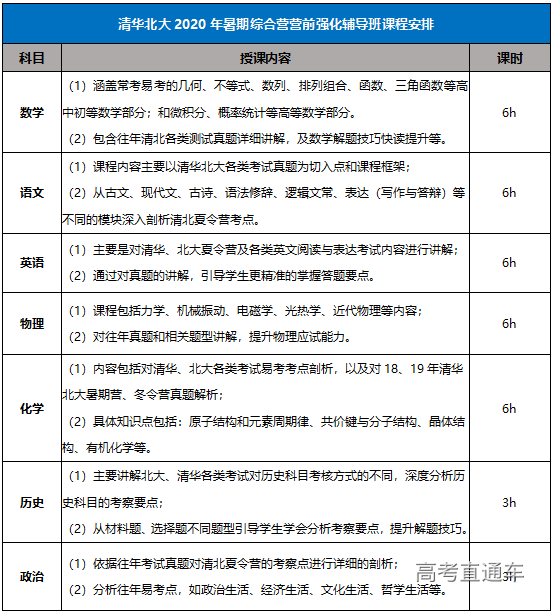 (1)课程采用北京华清园教育成熟的课程培养体系,拓展考生学科知识体系,“短、平、快”授课,强化拔高,使考生快速熟悉清华北大综合营考试风格;