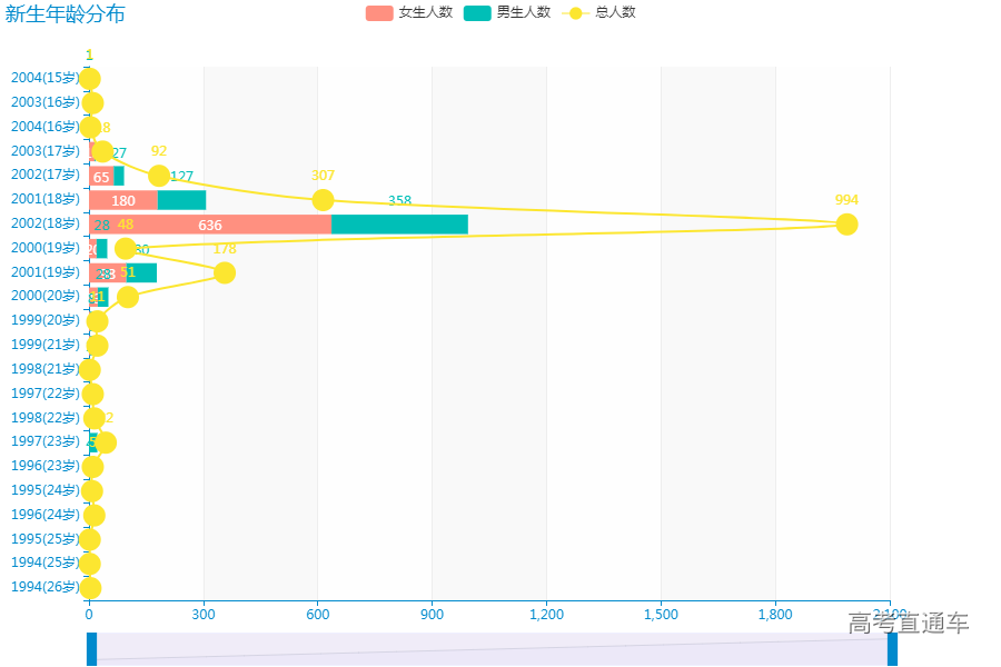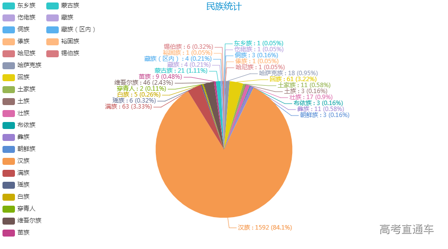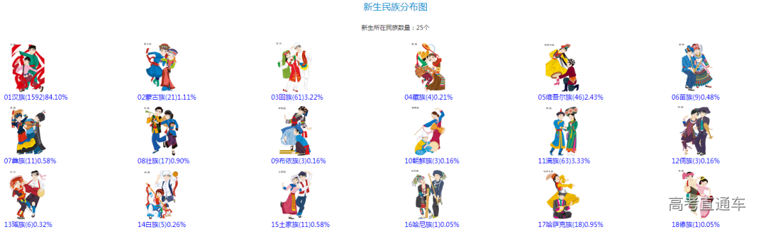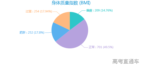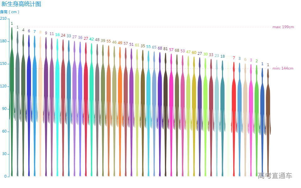 2020年学校共面向全国25个省、市、自治区录取本科新生1904人,除普通新生外,还包括高职升本科、双培计划、艺术类、内地新疆班、内地西藏班、少数民族预科班、第二学士学位等多种类型。 今年我校新生中,男生占比40%,女生占比60%。 2020级新生中,最大的26岁,最小的汪家辉同学2004年10月10日出生,今年15岁。 2020级新生中,身高最高的199cm,一定是个篮球健将吧。 不同身高分布图如下,请新生们“对号入座”。 今年新生的姓名中,最受欢迎榜如下:刘欣 3人,王曦 3人,李佳琦 2人,刘宇欣2人……最巧的是,2名刘宇欣同学都在同一个专业。 新生中,人数最多的姓是以下几种:张 125人,李109人,王105人,刘81人,赵45人。 新生中星座最集中的为狮子座 183人、金牛座163人、双鱼座 160人。 2020级新生来自全国710所不同中学, 录取人数比较多的几所中学为: 北京市房山区良乡中学26人; 北京市怀柔区第一中学24人; 北京市顺义区第一中学24人; 北京市顺义区杨镇第一中学23人; 北京市房山区房山中学22人; 北京市大兴区兴华中学21人; 北京市通州区永乐店中学20人; 北京市密云区第二中学20人; 首都师范大学附属密云中学19人; 北京市平谷中学19人。 数据显示,同一天出生的新生还不少呢:2002年7月10日出生的有12人;2002年7月26出生的有11人;2001年8月8日出生的有11人;2002年8月10日出生的有11人;2002年8月16日出生的有11人。 新生民族分布如下:汉族84.1%, 满族3.33%,回族 3.22%,维吾尔族2.43%,蒙古族 1.11%,壮族 0.9%。 11 身体质量分布图 49.5%身体质量指数正常,有约35%的同学体重偏重,同学们入学后要积极参加体育锻炼哦! 11 新生裸眼视力统计 新生视力正常7.62%,近视的同学高达82%,同学们一定要尽量合理利用电子产品,保护眼睛,从每天做起。