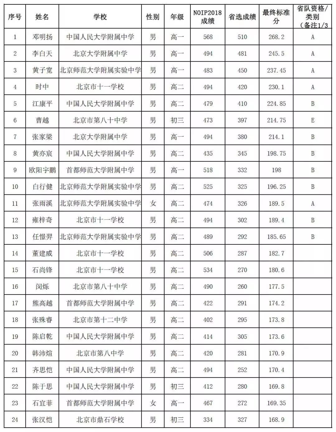 根据最终评测结果确定CCF NOI2019北京队共12人,现按照名额数200%公示北京队选拔活动选手总分的前24名: