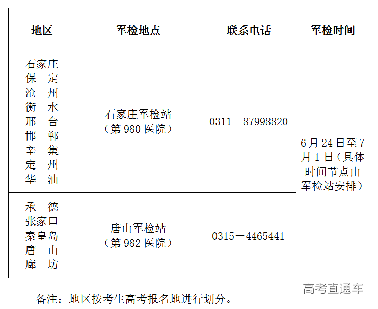 1.6月24日9时,考生可从河北省教育考试院网站(http://www.hebeea.edu.cn)查询是否列入军检范围,也可通过军分区、人武部查询。