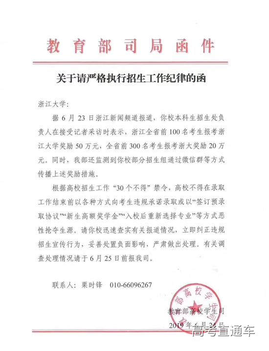 6月25日记者获悉,就近日浙江大学(分数线,专业设置)本科招生处负责人声称“浙江全省前100名考生报考浙江大学奖励50万元”等行为,教育部高校学生司向浙江大学发函,要求立即纠正违规招生宣传行为。