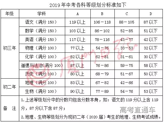 厦门中考实行考试科目全等级制度(体育除外)。语文、数学、英语、物理、化学、道德与法治、历史、地理、生物等学科(以下简称“九科”)的卷面分折成等级。 报考不同等级的学校,等级要达到学校要求,换句话说,等级相当于门槛,其它门槛还包括综合素质评价等等,过了“门槛”,等级、综合素质评价等就没有用了,就比中考成绩高低。 等级怎么折算? 以4:3:2:1来算等级的分数。 即每科,要确保前40%是A等级(排名在前40%),前70%是B等级以上…… 不同普高学校对等级要求不同 1. 除厦门三中、厦门一中集美分校、海沧中学和杏南中学外,其他省一级达标高中(含厦门一中海沧校区、科技中学翔安校区)和厦门实验中学: 要求:“九科”全部为C级以上(含C级)且至少三科达到A级;实验考试均合格;综合素质毕业总评六个维度全部达到良好以上(含良好)。 2.厦门三中、厦门一中集美分校、海沧中学和杏南中学,以及省二、三级达标高中: 要求:“九科”至少三科达到B级以上(含B级);实验考试均合格;综合素质毕业总评中道德品质和公民素养2个维度均达合格以上(含合格)。 3.其他普通高中: 要求:“九科”至少三科达到C级(含C级);实验考试均合格;综合素质毕业总评中道德品质和公民素养2个维度均达合格以上(含合格)。 4.五年制高职(艺术类、体育类除外): 要求:“九科”至少三科达到C级(含C级),综合素质评价毕业总评中道德品质和公民素养2个维度均达合格以上(含合格),其中师范类专业应持有本市户籍,要求面试的专业应经面试合格(面试比例为1:1.5)。 5.特长类招生和艺术类、体育类五年制高职: 要求:综合素质毕业总评中道德品质和公民素养2个维度均达合格以上(含合格)。 6.在厦国家级、省级重点中等职业学校、本市其他中等职业学校和本市以外的中等职业学校: 要求:参加我市中考的考生均可填报,其中现役军人子女可在全市范围内任选中等职业学校就读(专业由学校根据中考成绩进行调剂)。 省一级达标高中(19所): 厦门一中、双十中学、厦门六中、外国语学校、科技中学(厦门大学附属科技中学)、集美中学、同安一中、厦门二中、松柏中学、湖滨中学、厦门十中、海沧实验中学、翔安一中、启悟中学、厦门第二外国语学校、厦门三中、海沧中学、灌口中学(厦门一中集美分校)、杏南中学。 省二级达标高中(9所): 华侨中学、大同中学、禾山中学、乐安中学、五显中学、新店中学、内厝中学、国祺中学、厦门实验中学(已经通过省一级达标高中评估)。 省三级达标高中(1所): 英才中学。 尚未定级高中(2所): 康桥中学、厦门工学院附属学校。