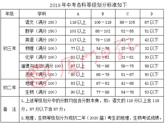 二、九科等级也公布了 经市中招领导小组研究同意,市教育招生考试中心于7月10日公布今年的中考成绩和各中考科目等级划定标准。 市招考中心通过短信平台将初三年考生的成绩发到考生所填写的监护人手机,初三年考生还可通过“2019年厦门市中招志愿网上填报系统”(https://zy.xmzskszx.net,以下简称“中招志愿填报系统”)查询到自己的各科考试成绩及等级、投档总分、全市投档位次、片区投档位次。7月11日考生可到报名点领取中考成绩报告单。初二年考生的成绩也将通过短信平台发送到考生所填写的监护人手机,考生还可以向报名点学校查询成绩。 考生应根据自己的投档总分、投档位次和各科等级组合,对照招生计划册的《高中各类学校招生计划分配表》中不同学校(专业)的综合素质评价等级、各科目等级、实验考试等级、招生片区以及专业测试、体检、面试、户籍等方面的要求,认真选择和填报志愿。 市招考中心特别提醒考生:今年采用网上填报志愿的方式进行志愿填报,考生应登录“中招志愿填报系统”(https://zy.xmzskszx.net,)填报志愿,考生网上填报的志愿是投档和录取的唯一依据。志愿填报时间:7月13日8时起至7月15日20时止。