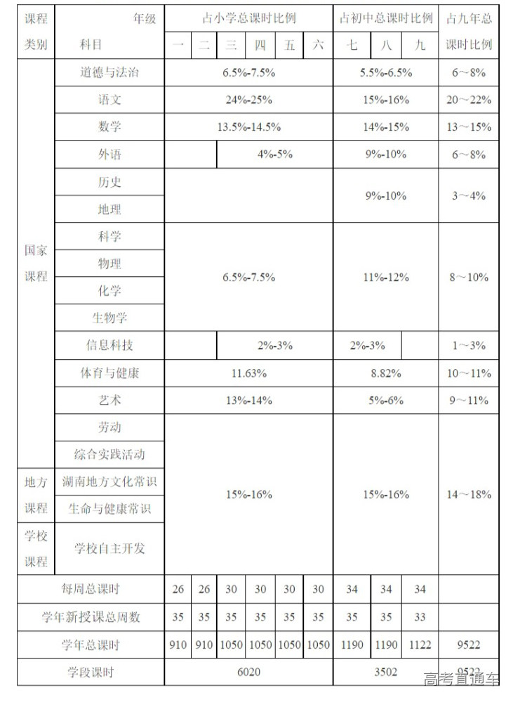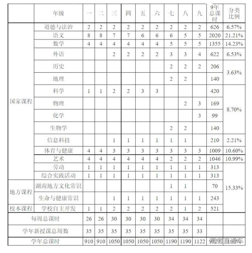 体育与健康一至二年级每周4课时,三至九年级每周3课时;书法在三至六年级语文中每周安排1课时;劳动、综合实践活动每周均不少于1课时;班团队活动原则上每周不少于1课时。湖南地方文化常识七至八年级每周1课时;生命与健康常识三至九年级每周1课时。