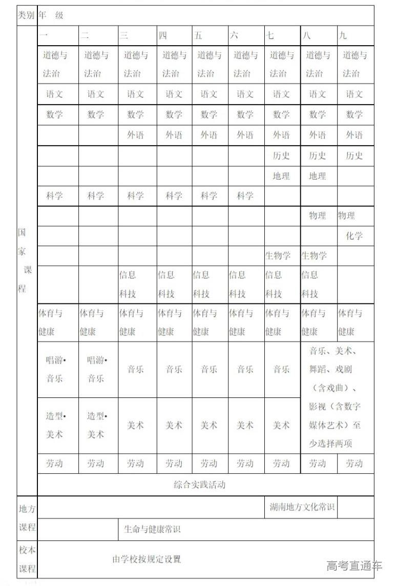 地方课程由省教育行政部门统一组织开发,设置湖南地方文化常识、生命与健康常识两门课程。湖南地方文化常识在七至八年级开设,生命与健康常识在三至九年级开设。