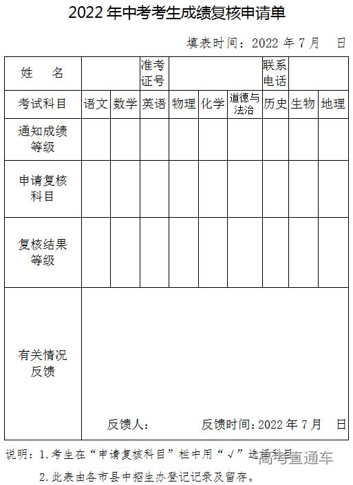 (一)提出申请。考生在7月17日17:00前,持本人准考证到市县中招办申请复核并填写申请单(见附件2,考虑疫情防控工作需要,海口市考生提交申请的方式由海口市中招办另行公告),由市县中招办汇总后于7月18日18:00前报送省中招办。
