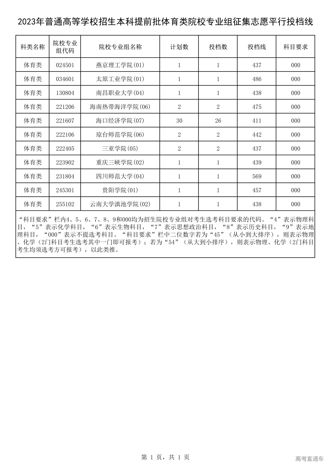 2023年海南省普通高等学校招生本科提前批体育类院校专业组征集志愿平行投档线
