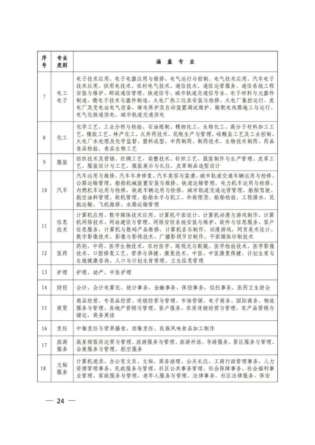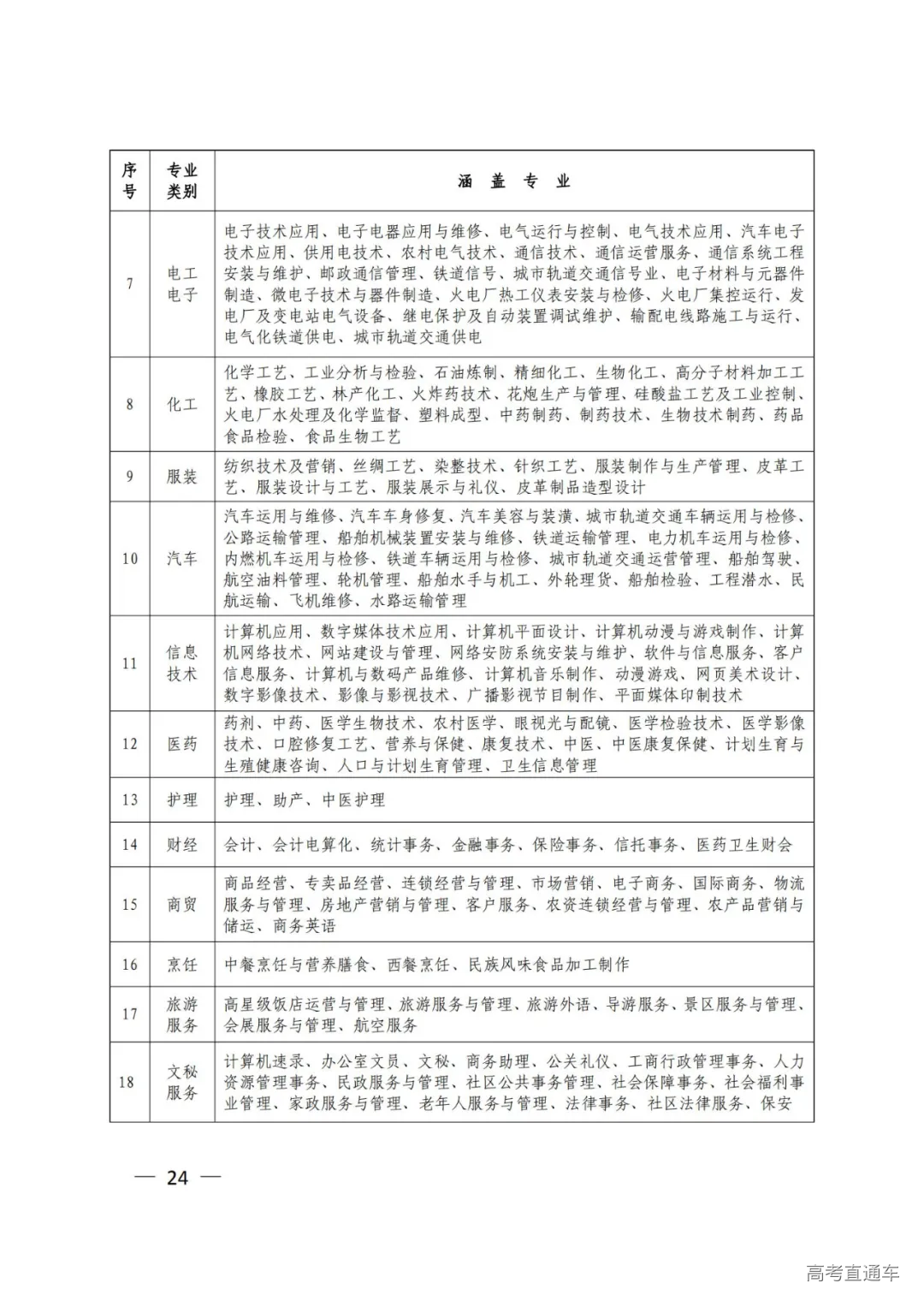春季高考分为18个专业类别,分别为农林果蔬、畜牧养殖、学前教育、土建、机械、机电一体化、电子电工、化工、服装、汽车、信息技术、医药、护理、财经、商贸、烹饪、旅游服务、文秘服务,考生必须选择报考专业类别(各类别涵盖专业范围见附件2)。