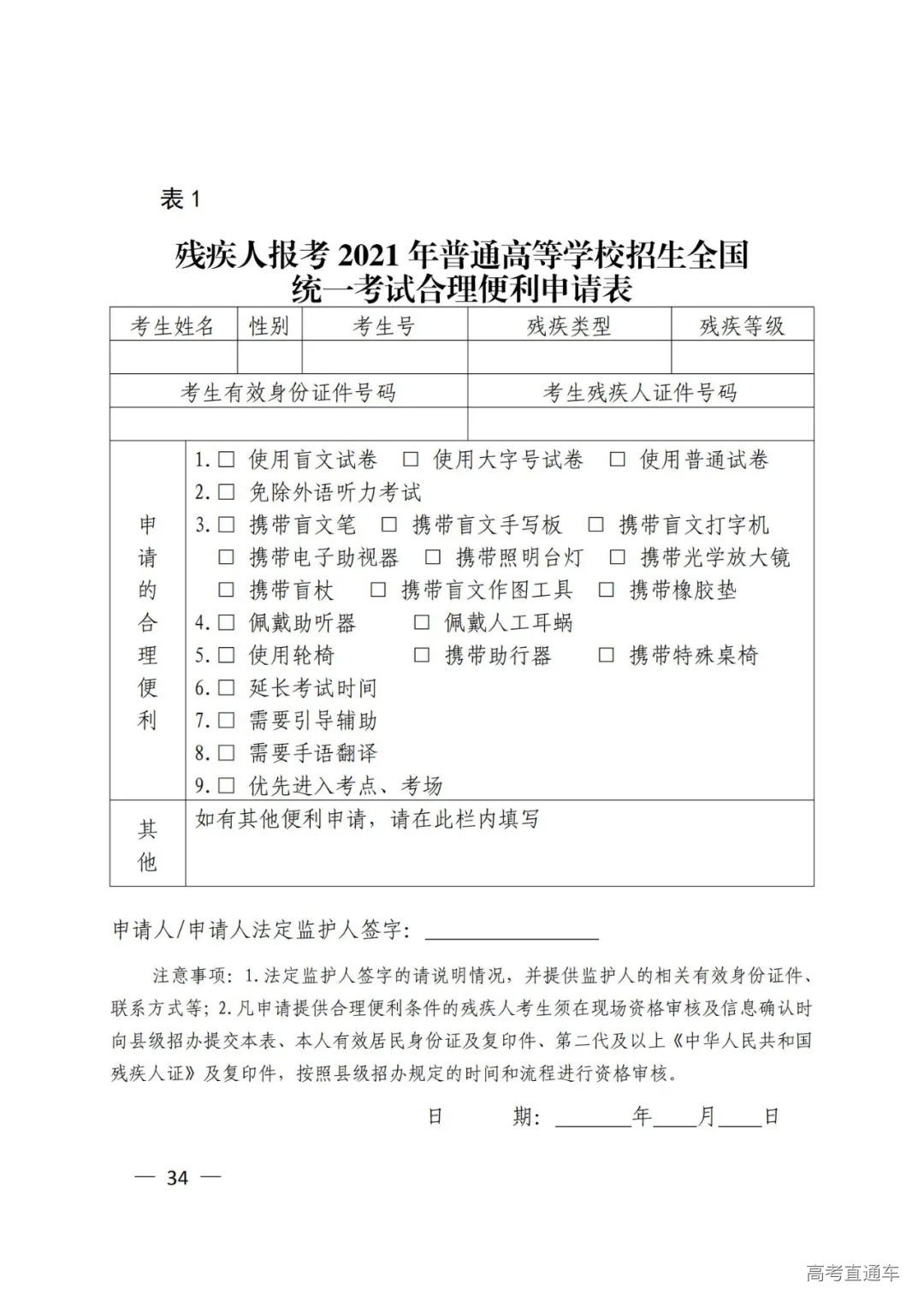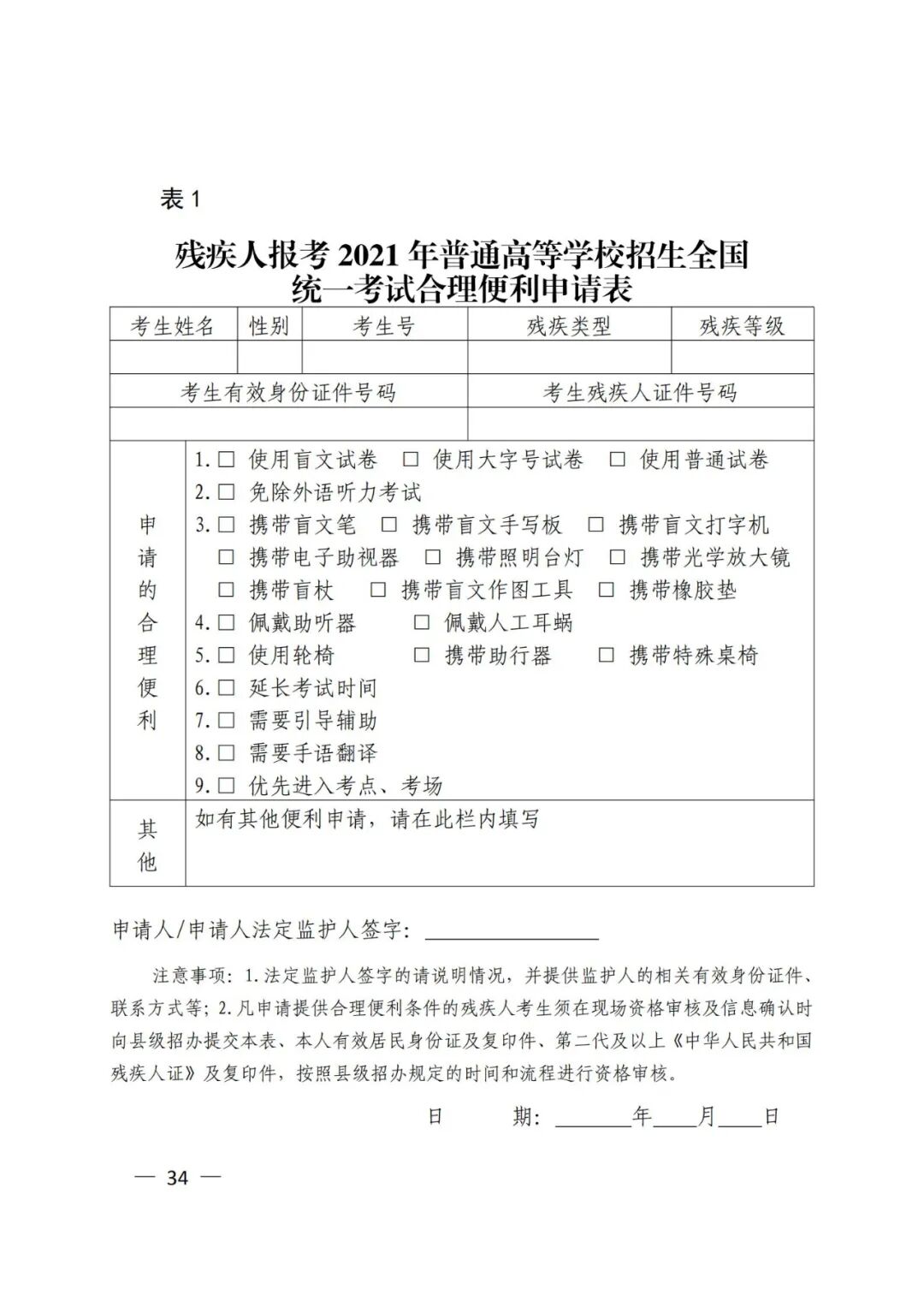 残疾人考生网上报名时首先选择本人残疾类别(共8个类别,分别为视力残疾、听力残疾、言语残疾、肢体残疾、智力残疾、精神残疾、多重残疾和其他残疾,考生选择其中的1项),填写本人残疾证号码,然后选择是否申请提供夏季高考合理便利条件。申请提供合理便利的考生应下载并按要求填写《残疾人报考2021年普通高等学校招生全国统一考试合理便利申请表》(以下简称《合理便利申请表》,见附件4表1),并在现场资格审查及信息确认时向县级招办提交填写并签字的《合理便利申请表》、本人有效居民身份证及复印件、第二代及以上《中华人民共和国残疾人证》及复印件,按照县级招办规定的时间和流程进行资格审核。