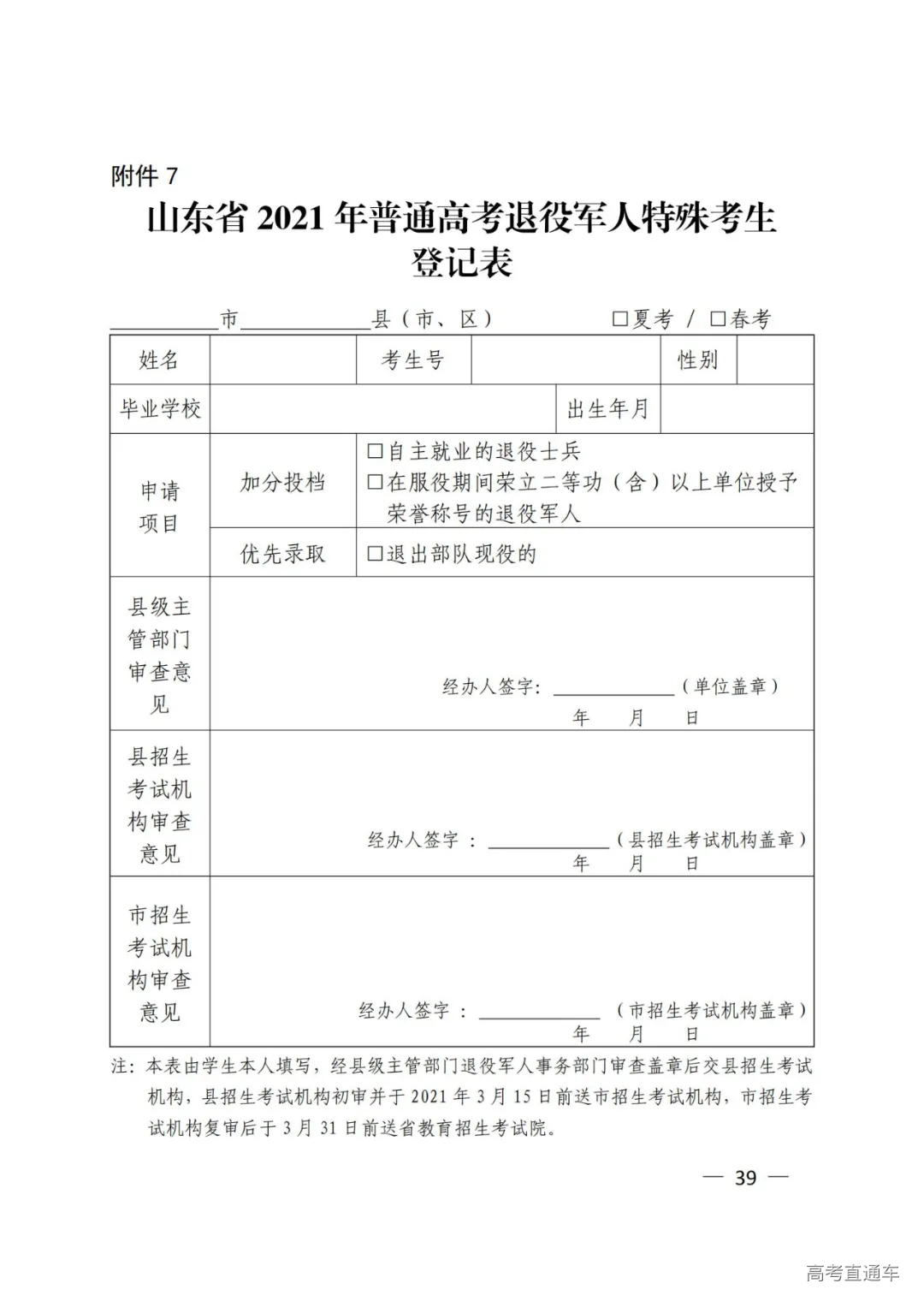 7.山东省2021年普通高考退役军人特殊考生登记表