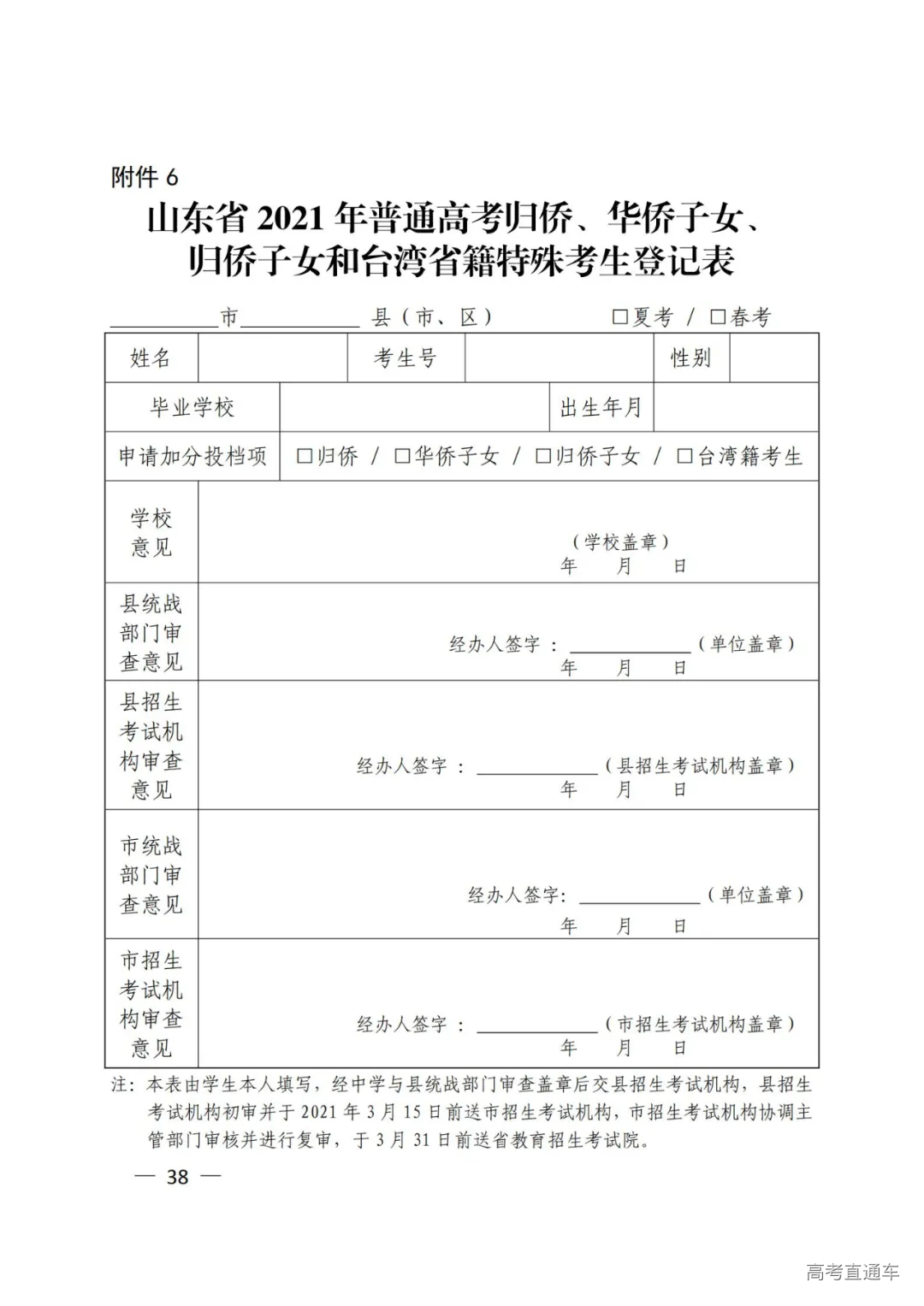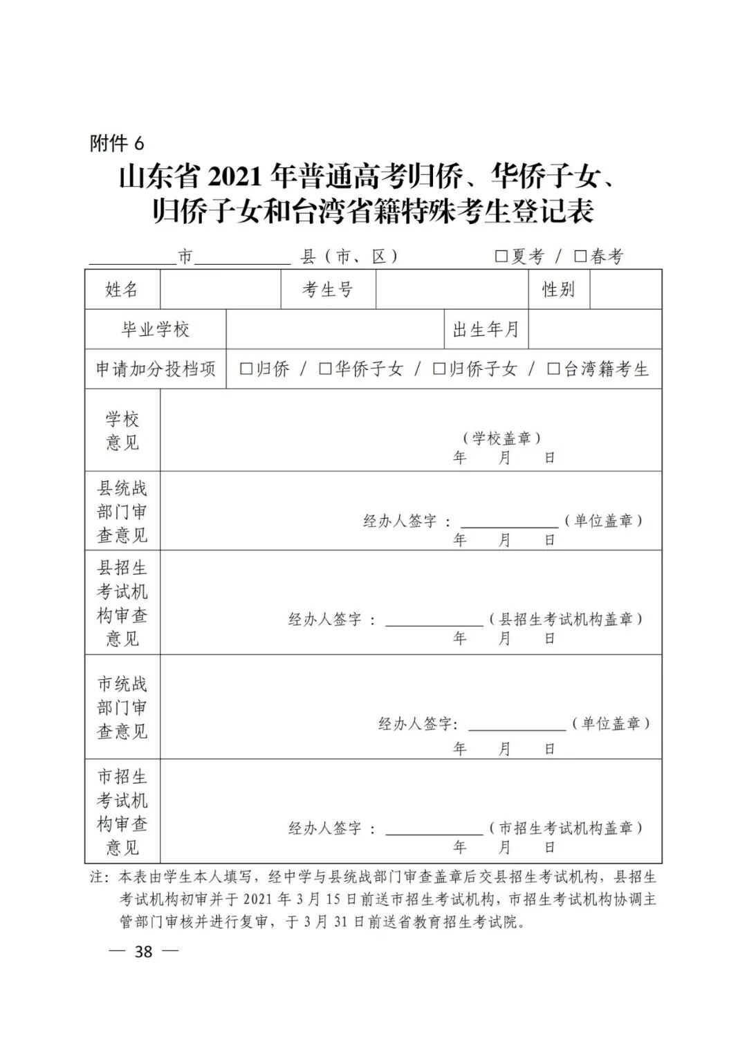 6.山东省2021年普通高考归侨、华侨子女、归侨子女和台湾省籍特殊考生登记表