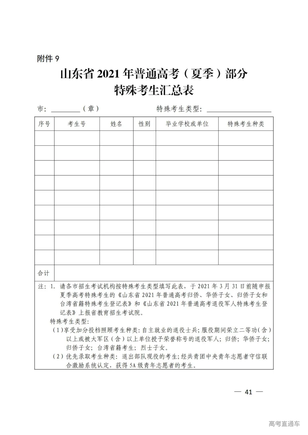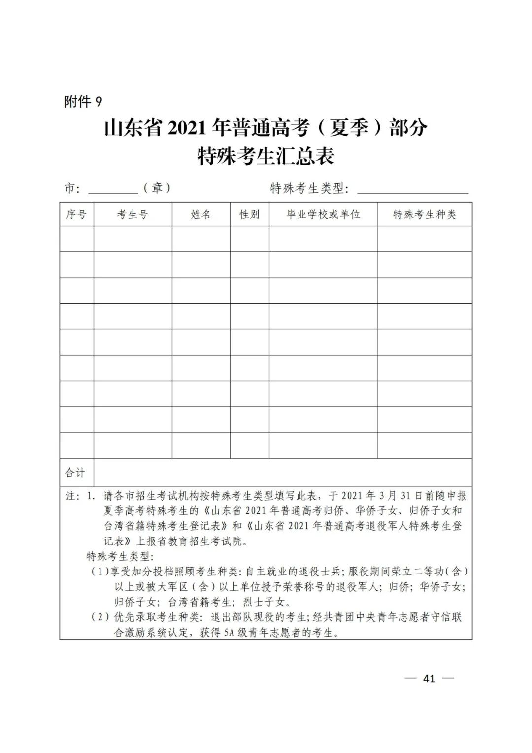 9.山东省2021年普通高考(夏季)部分特殊考生汇总表