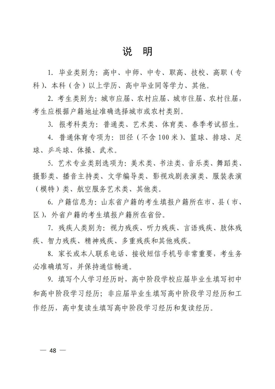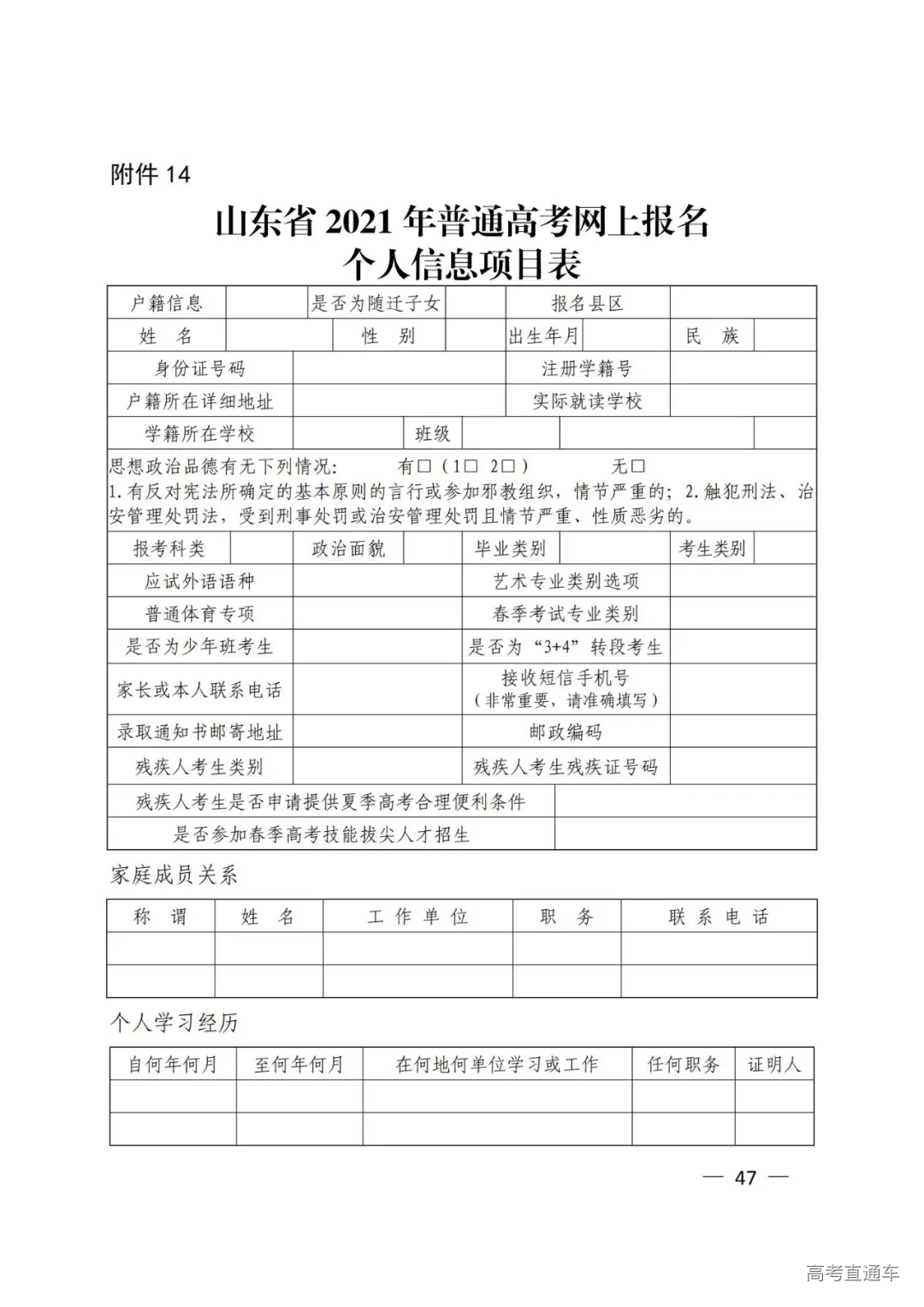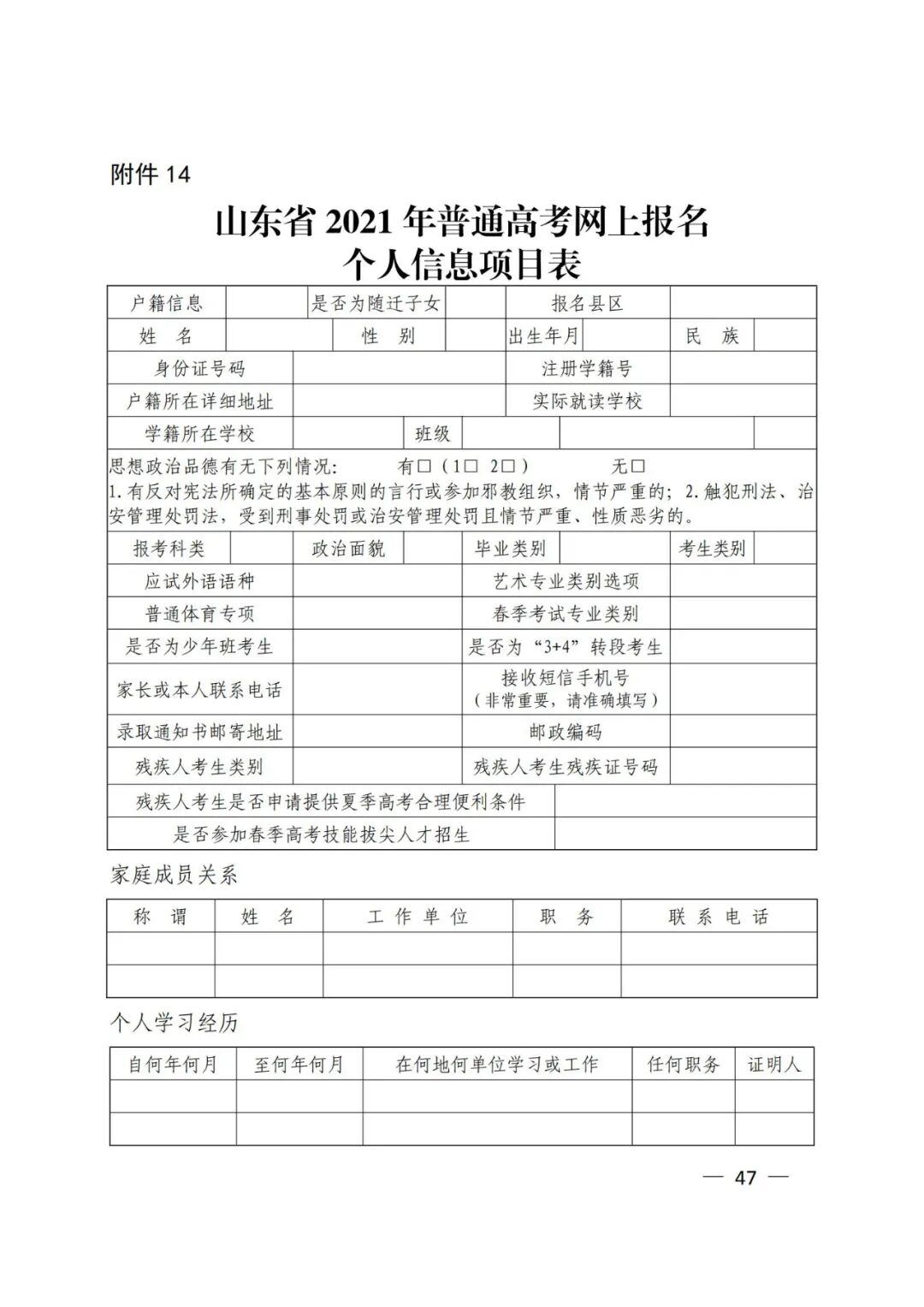 14.山东省2021年普通高考网上报名个人信息项目表