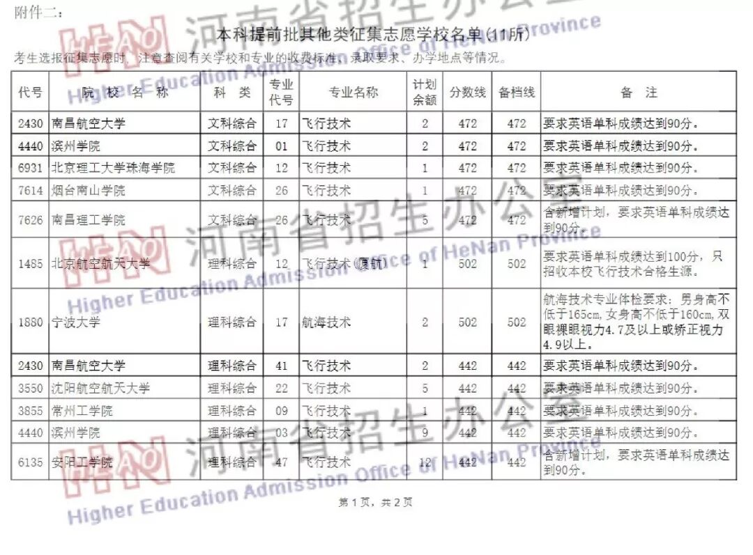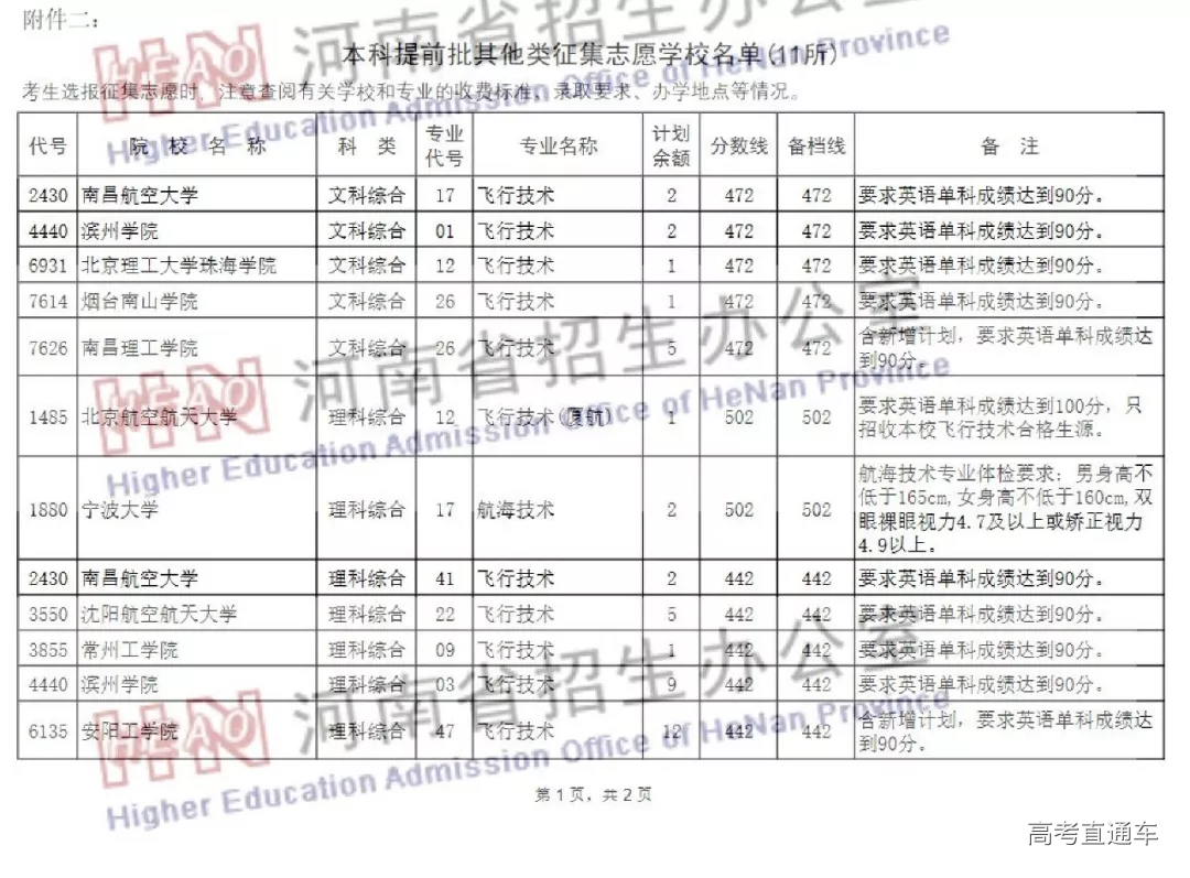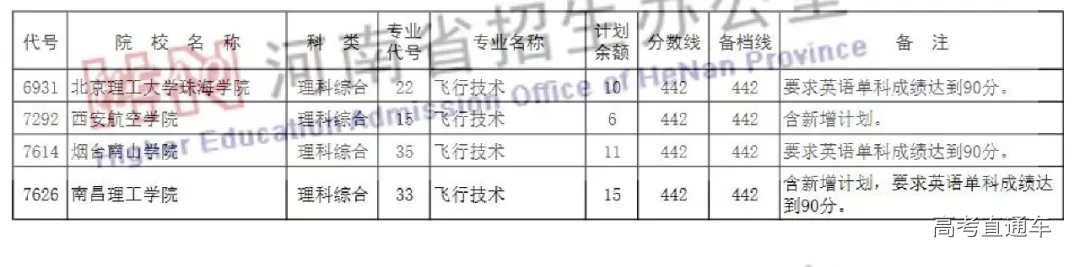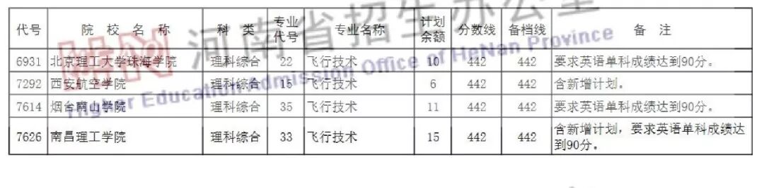 (三)提前录取的其他类本科:沈阳航空航天大学、滨州学院、南昌航空大学、常州工学院、安阳工学院、北京理工大学珠海学院、西安航空学院、烟台南山学院以及南昌理工学院飞行技术专业要求考生民航一级体检合格、政审通过,文科472分以上,理科442分以上,英语成绩90分以上。