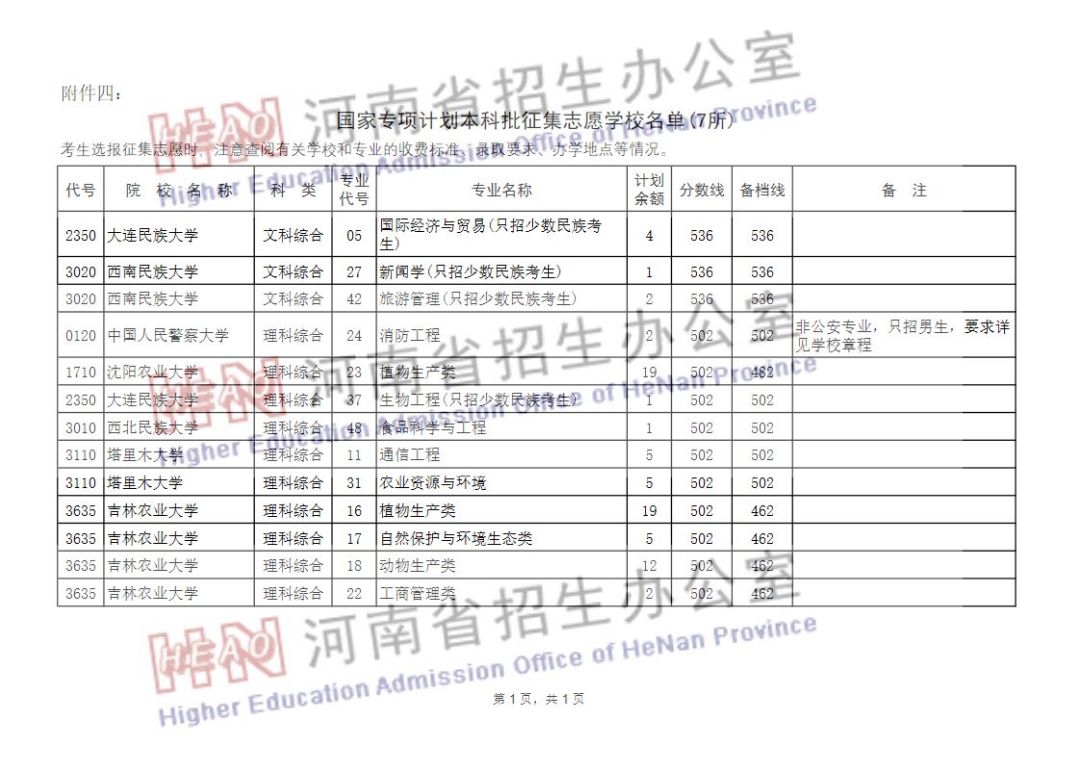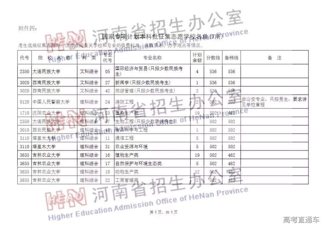 国家专项计划本科批征集志愿学校名单(7所)