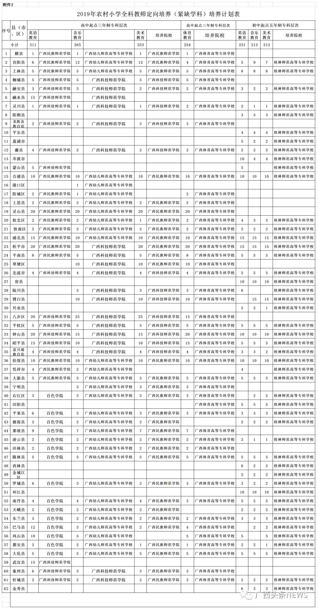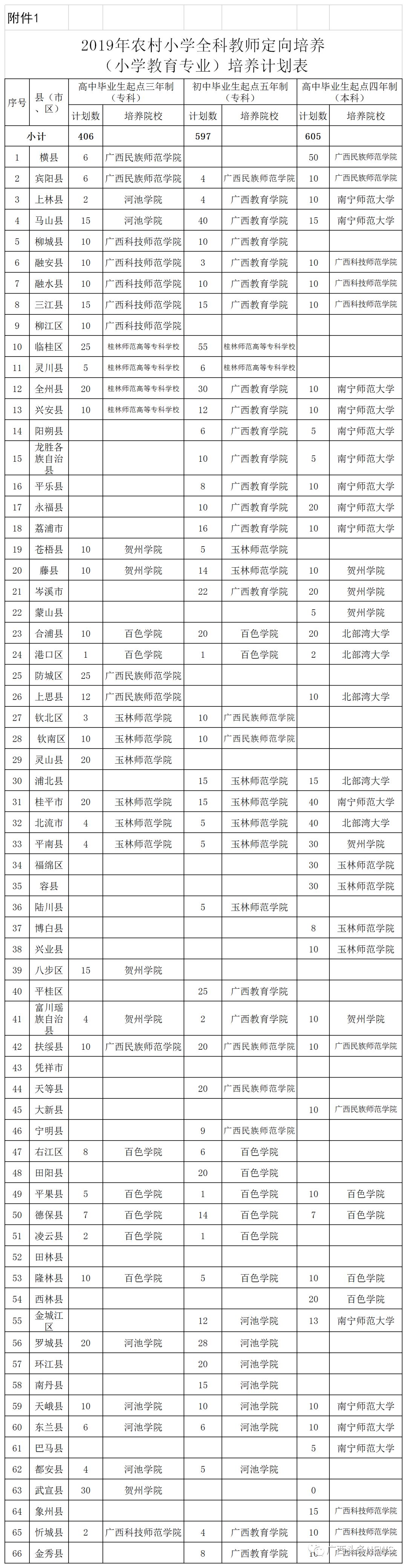 2019年,立足农村教师素质需求,广西将继续定向招录一批初中、高中优秀毕业生,培养一批既能适应基础教育改革发展和全面实施素质教育需要,又能承担农村小学各门课程教学任务的全科教师。