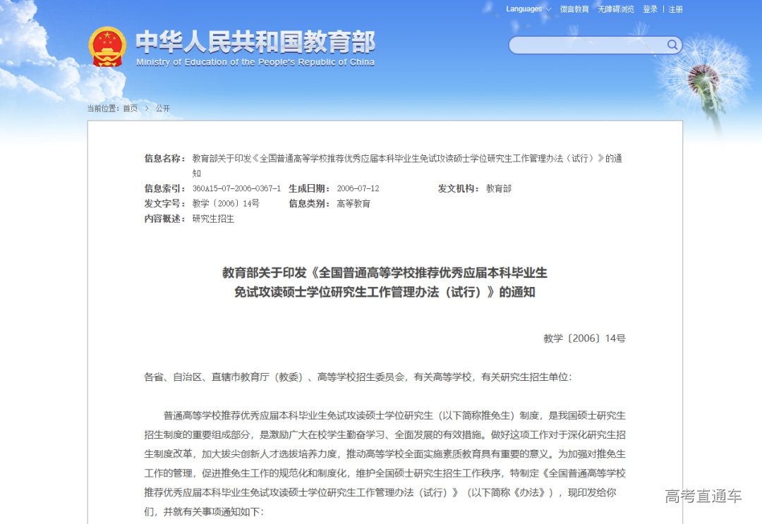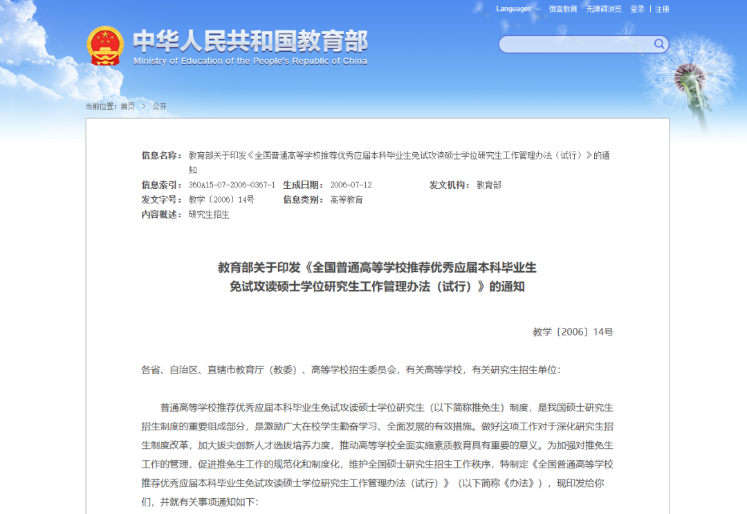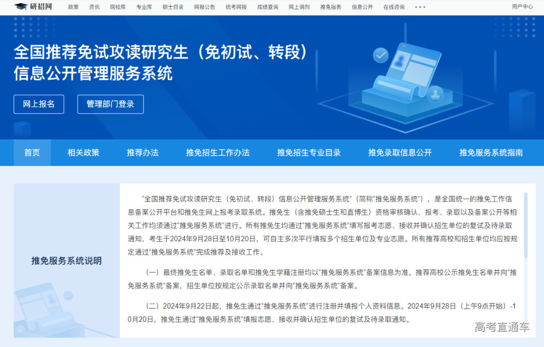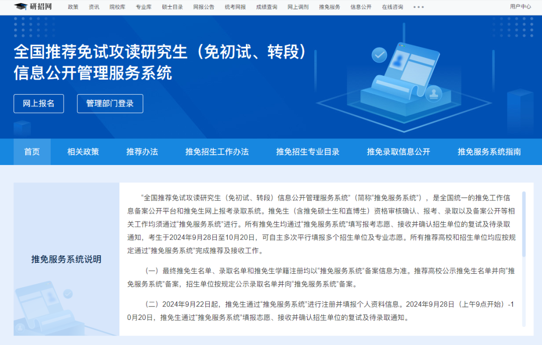 日前,本年度全国推荐免试攻读研究生(免初试、转段)信息公开管理服务系统正式开放。推免生(含推免硕士生和直博生)进入资格审核确认、报考、录取以及备案公开等阶段。对于学生而言,推荐免试攻读硕士研究生是升学的有力途径。对高校来说,拥有推荐资格也是一种办学优势。